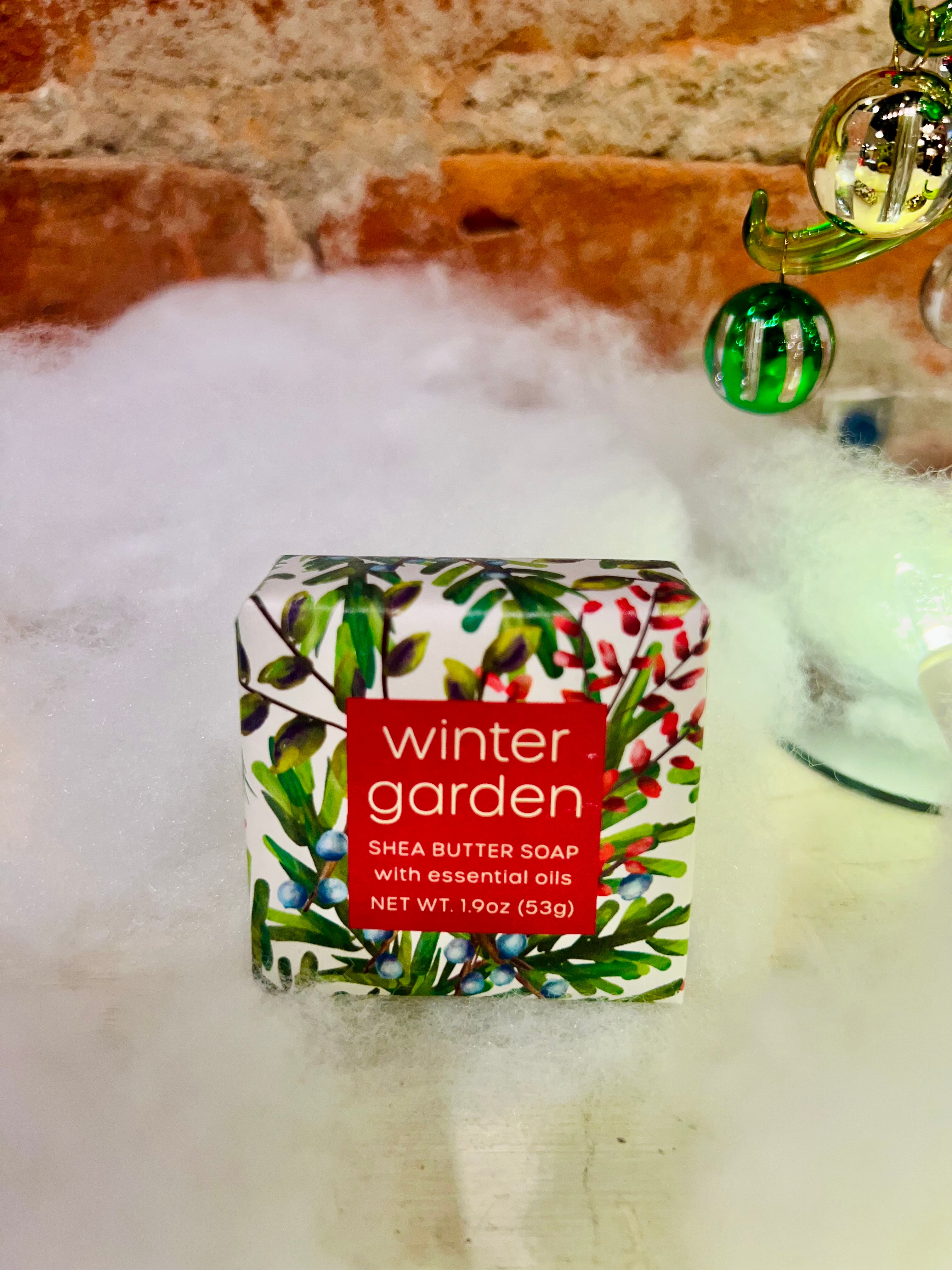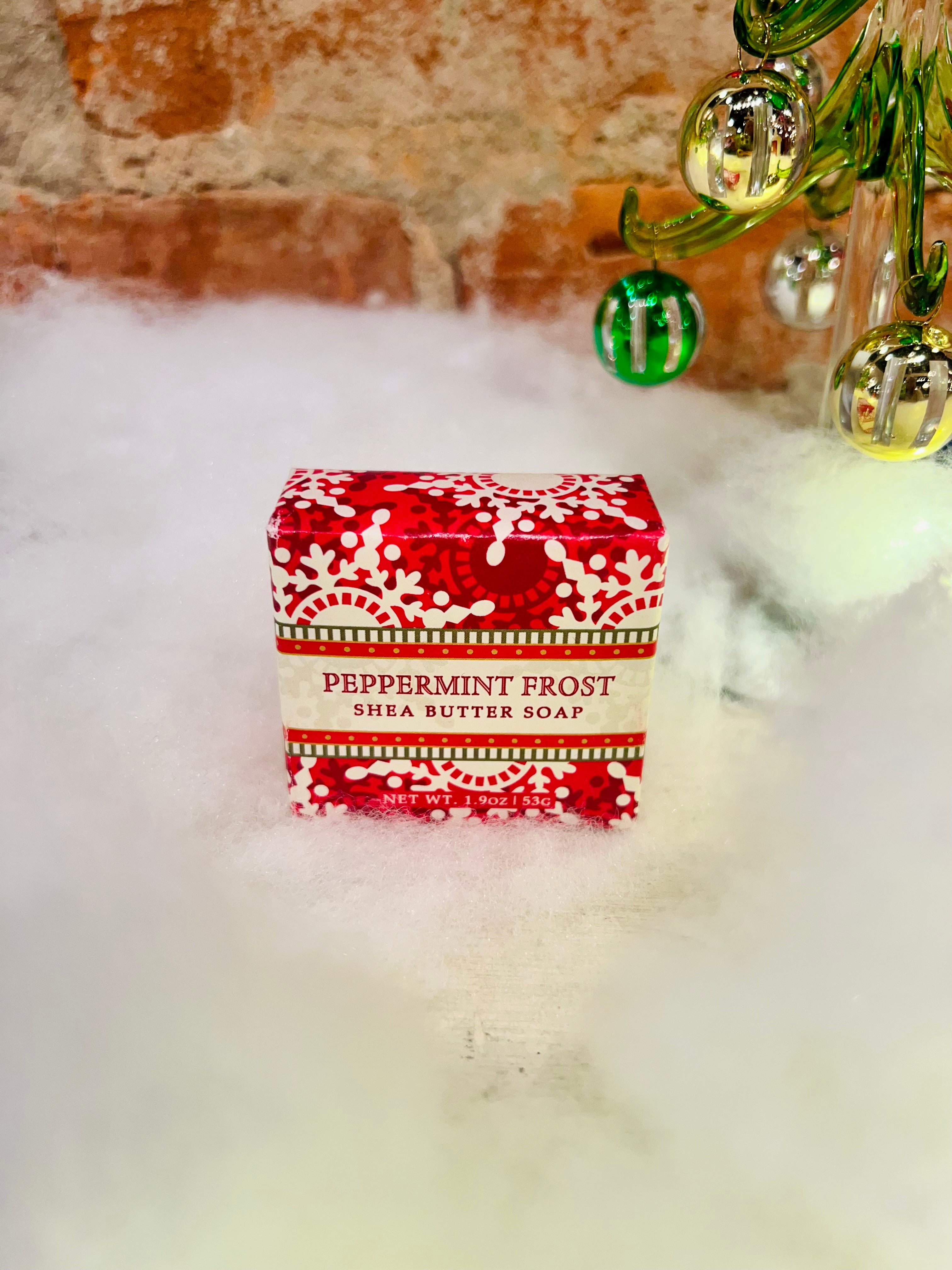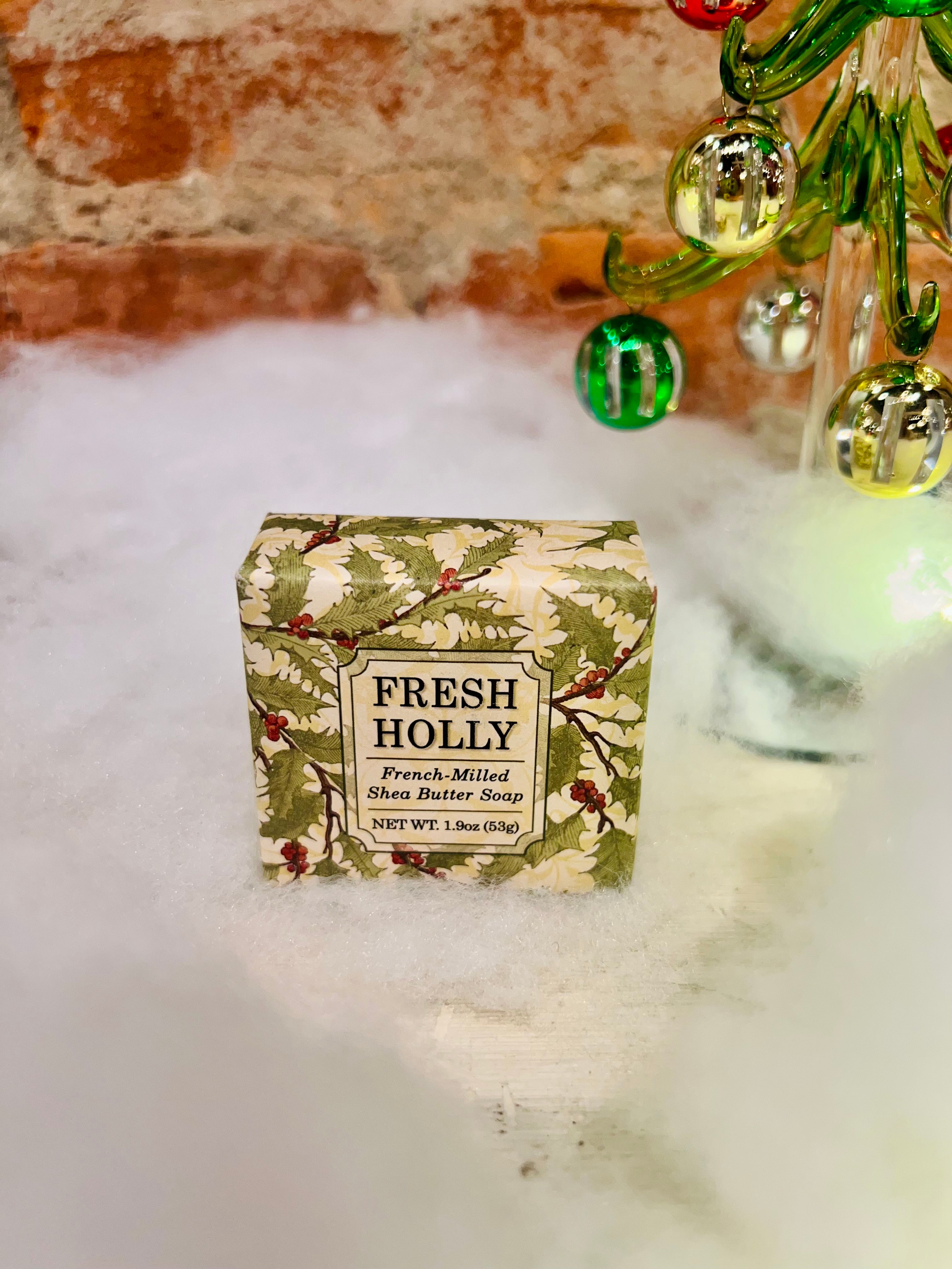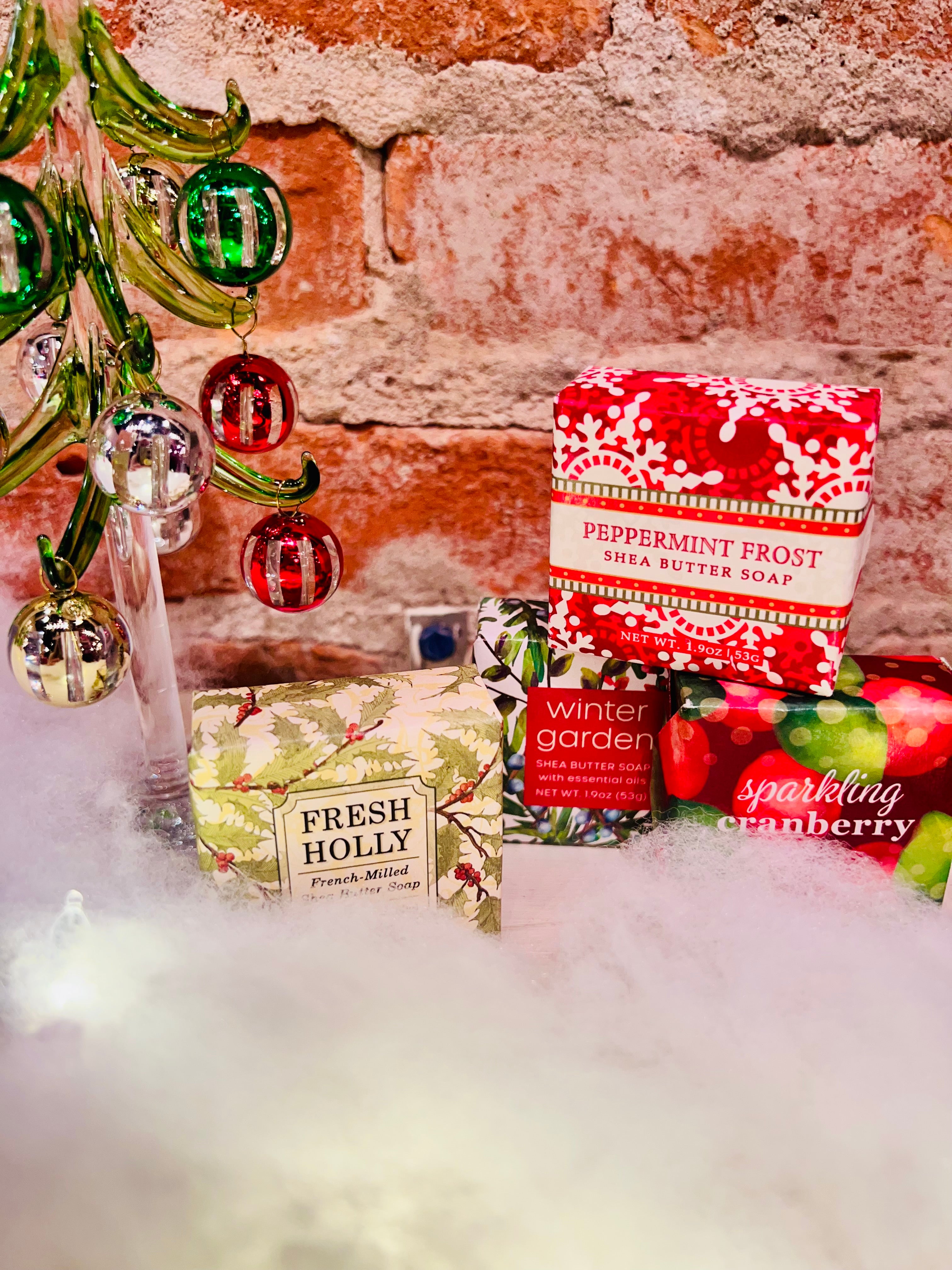 Crisp evergreens, sugared fruit, rich berries and warm spices . . . our luxurious spa products welcome the Holidays with the scents of the Season. French-milled, luxurious vegetable soaps enriched with shea butter, essential oils & natural extracts, paper-wrapped and offered in a 1.9oz mini soap square!