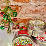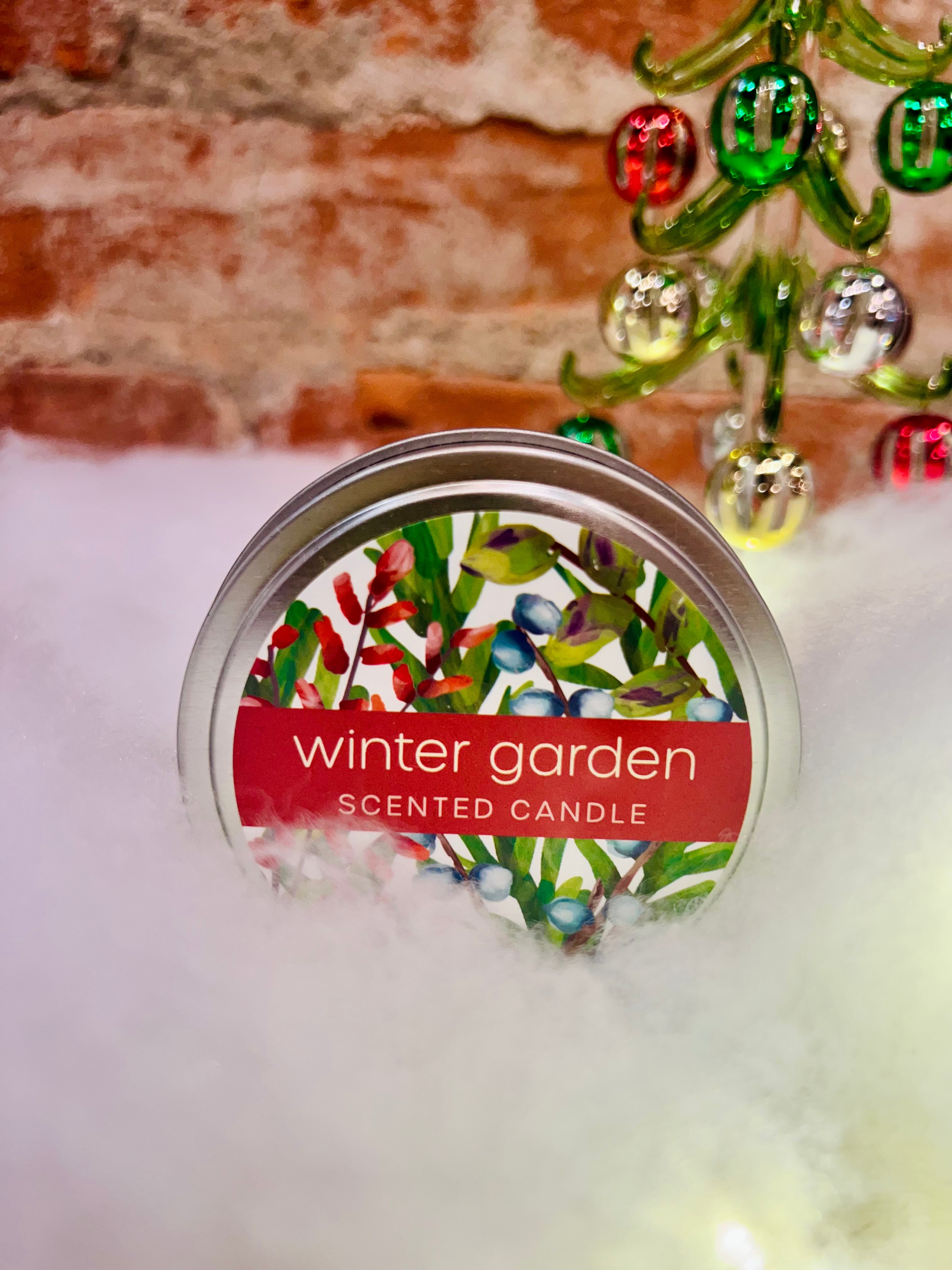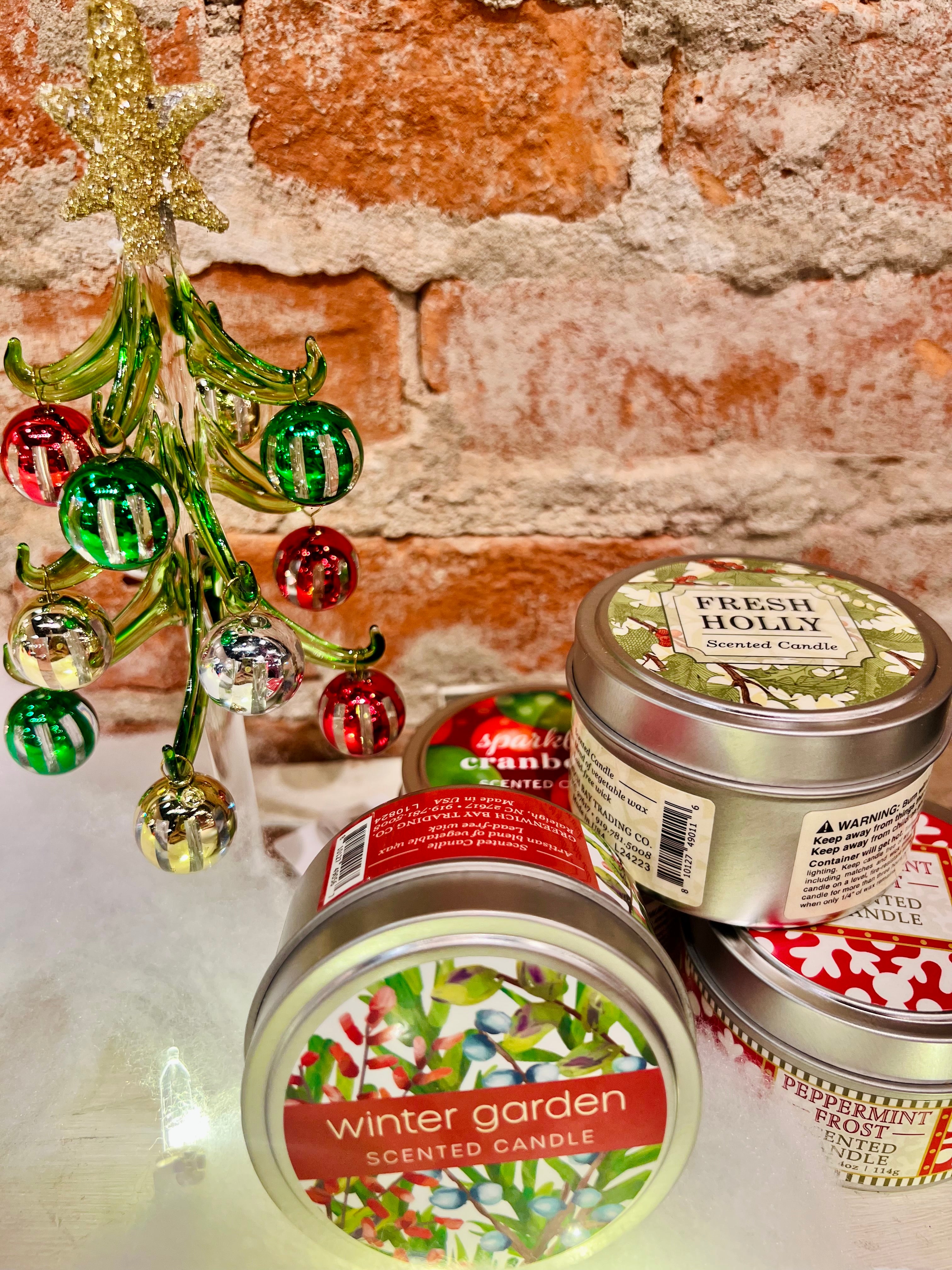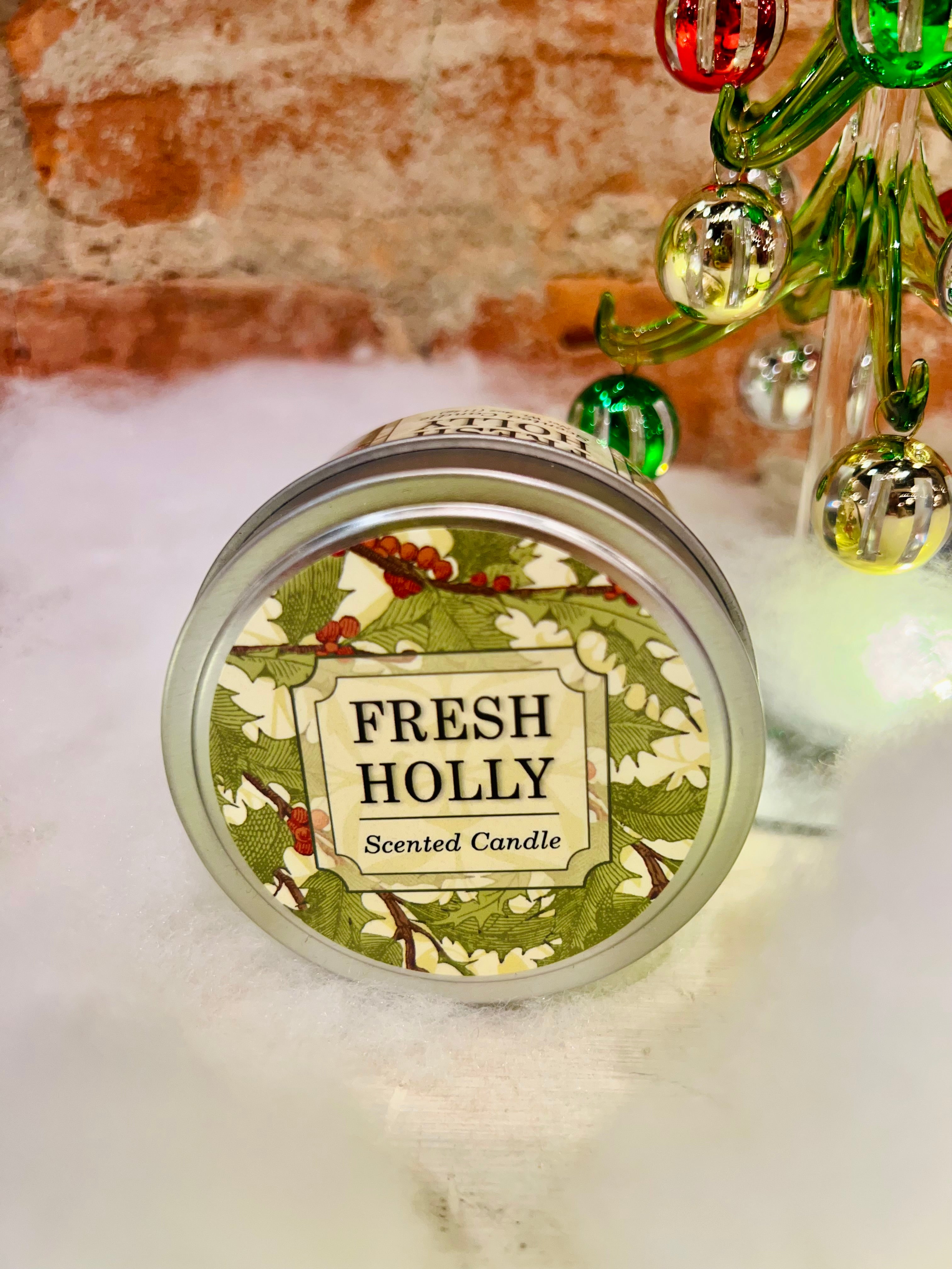 Hand-poured, single-wick candles in decorative Holiday tins for home or travel. Crafted from an artisan blend of vegetable wax in Fresh Holly, Lavender Birch, Peppermint Frost, Sparkling Cranberry and Winter Garden scents. Offered in a 4oz candle size, with a lead-free wick.