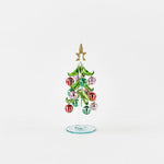 This 180-degree glass Christmas tree is the perfect table decoration for the holiday season. With its 8" size and multi-colored dangle ornaments, this tree stands as a beautiful, festive addition to any home.