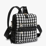 Amelia Houndstooth Backpack with Guitar Strap blends versatility and timeless style. Its convertible design effortlessly transitions between backpack and shoulder bag, offering flexibility for various occasions. With two front zipper pockets and a back slip pocket, it provides convenient storage for essentials on the go. Perfect for everyday use and back-to-school needs. Crafted from fabric with vegan leather accents, it's durable and stylish.