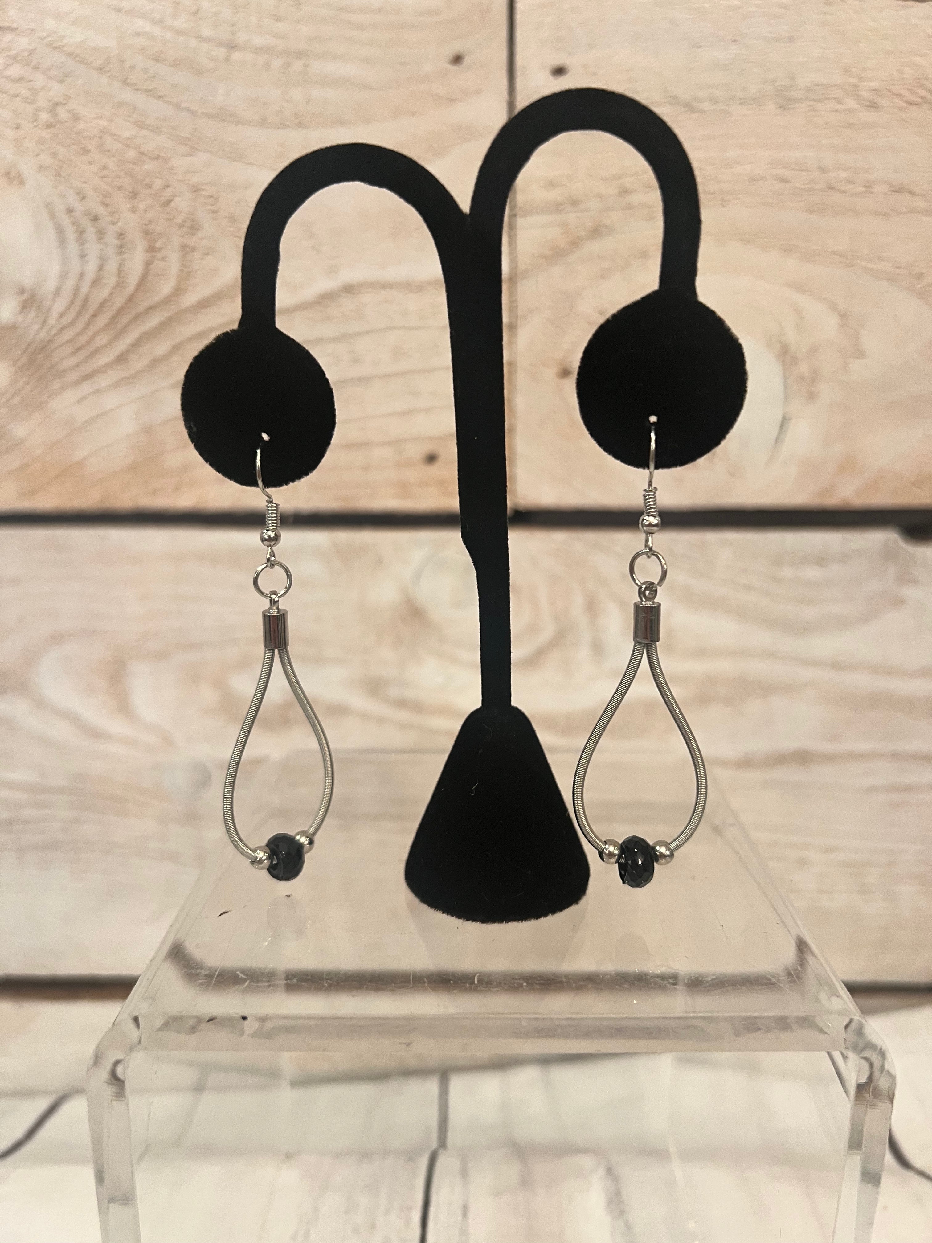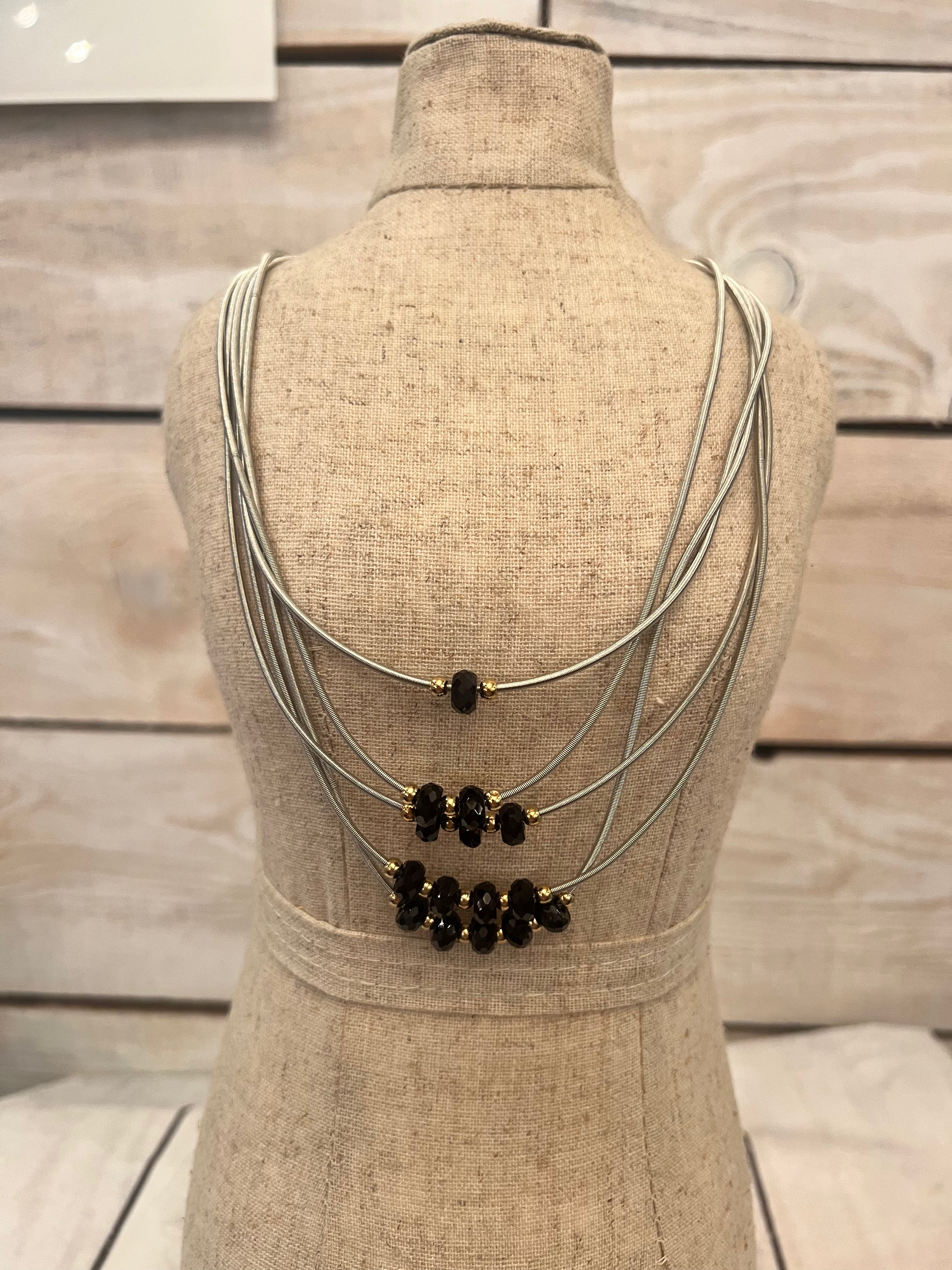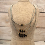 We love how sparkly these black beads are on this necklace & earring set! The necklace has a magnetic closure with multi strands & black & gold beads. The earrings are matching drop wires with black beads