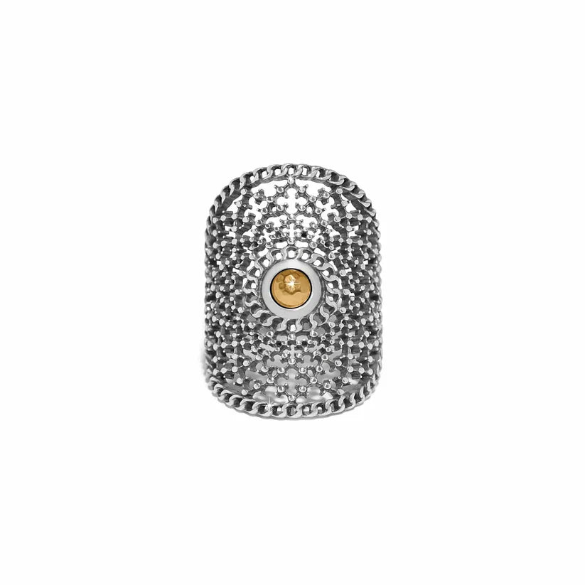 The Segreta collection is born in the shadowed hush of stone cathedrals, where secrets are whispered through carved lattices and light filters in like silent grace. Inspired by the intricate metalwork found in Catholic confessionals—those sacred veils between the visible and the unseen—Il Segreta transforms ancient ornaments into intimate, wearable relics. Each piece is a tactile remembrance of what is shared in silence, endured in strength, and held in the soul. Forged in a brushed silver and gold, the pieces like these earrings echo both contrast and unity.
