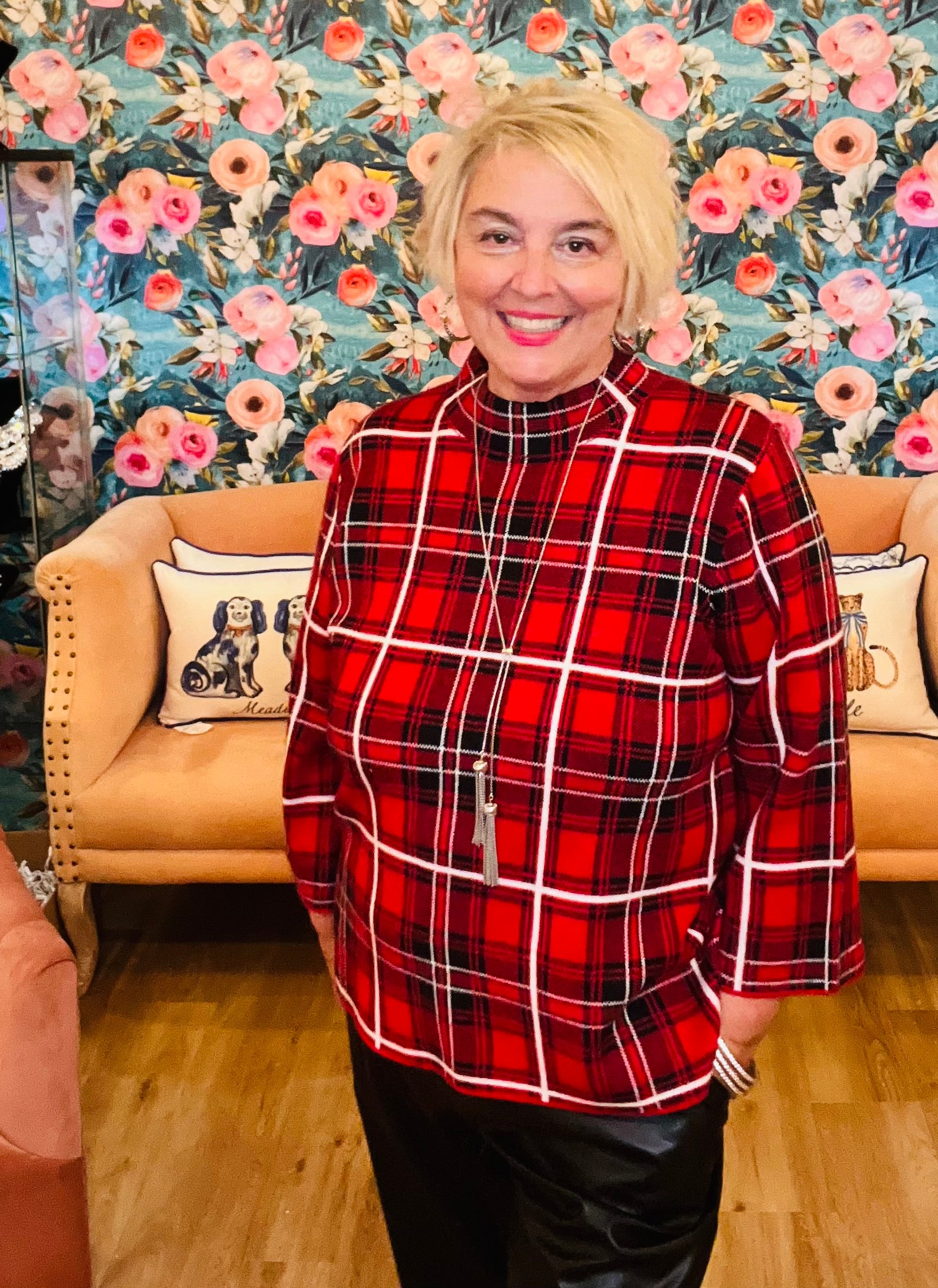 You will radiate cheerfulness in this plaid sweater by Entro! It would look so sharp with black leather pants for your next holiday party. Or bundle up on a chilly day with a black beanie & leggings!
