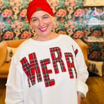 Show your festive side! This oversizied ribbed sweatshirt by Bibi has "merry" on the front in tartan plaid fabric. It's an oversized fit so size down!