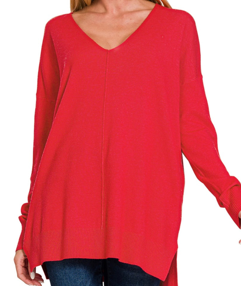 A Zenana best seller! This classic front seam sweater is perfect for work or casual everyday wear. It runs oversized & has a v-neck detail