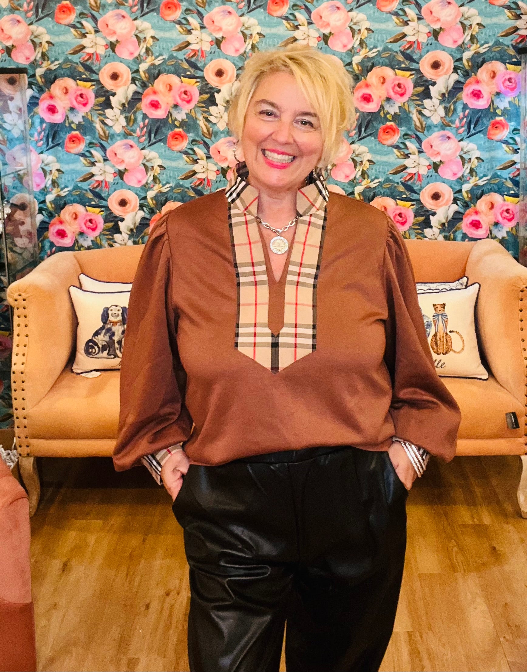 Plaid trim on collar & neckline
