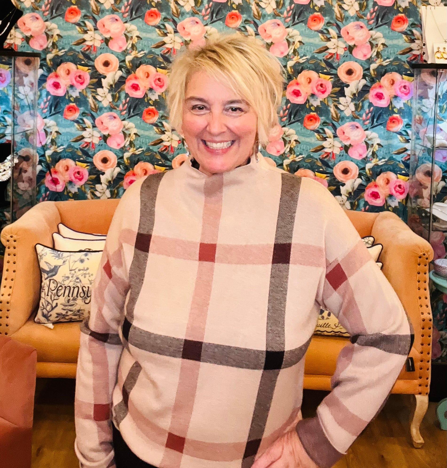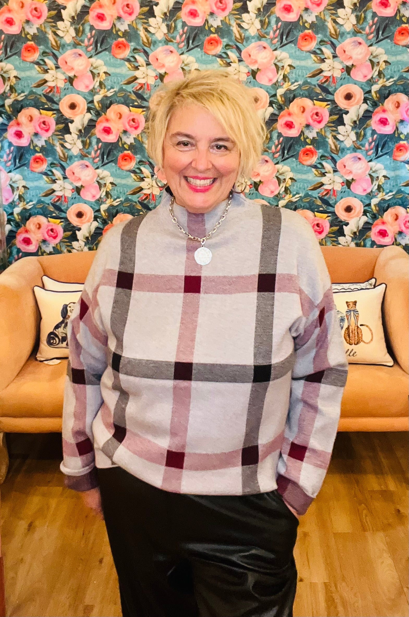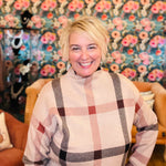 A high fashion sweater at an amazing price! This tan plaid patterned sweater has a mock neck & long sleeves. It would look fabulous with leather pants & heeled booties this fall!