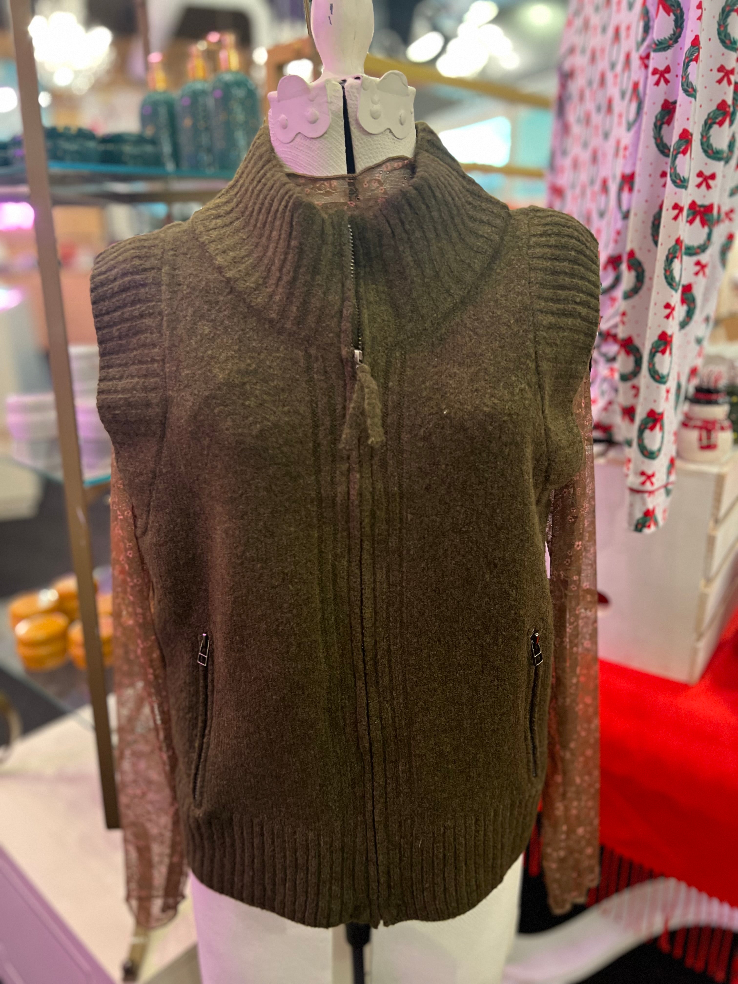 A fun twist on your typical sweater vest! This one zips down the front like a typical vest, it doesn't go over your head! Wear it over top of our brown & pink floral mesh top this fall