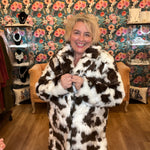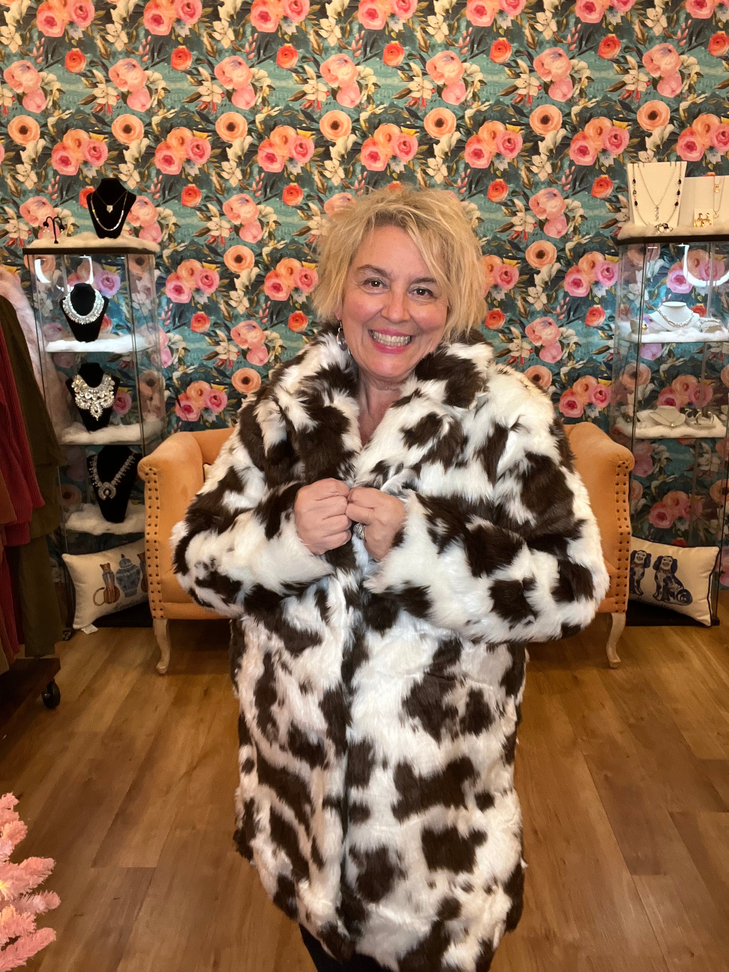 Straight from the wild west or rodeo! This Mid length coat with cow print faux fur, notched collar, and hidden snap closures for a cozy western look.