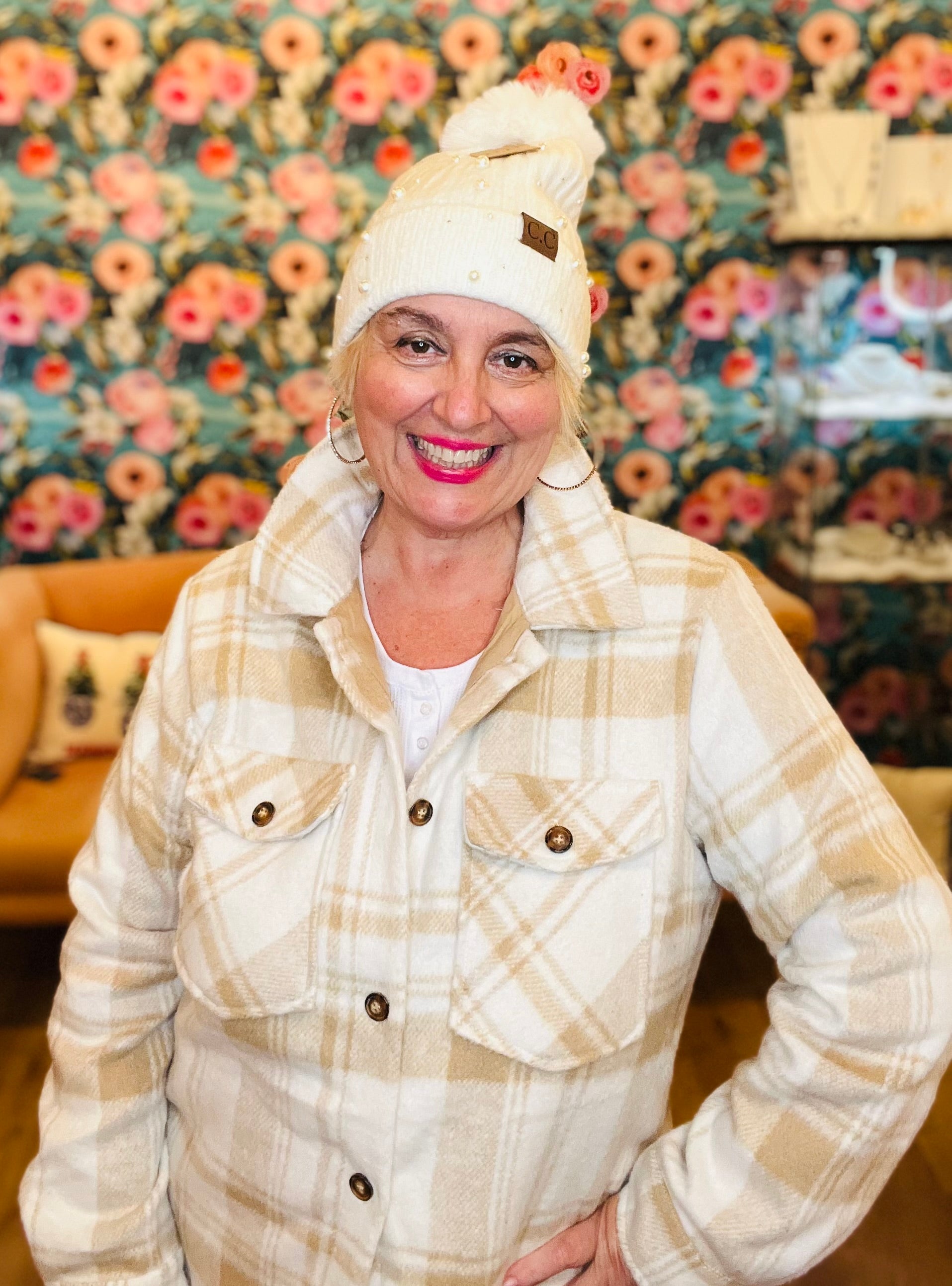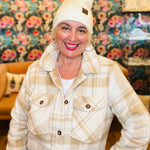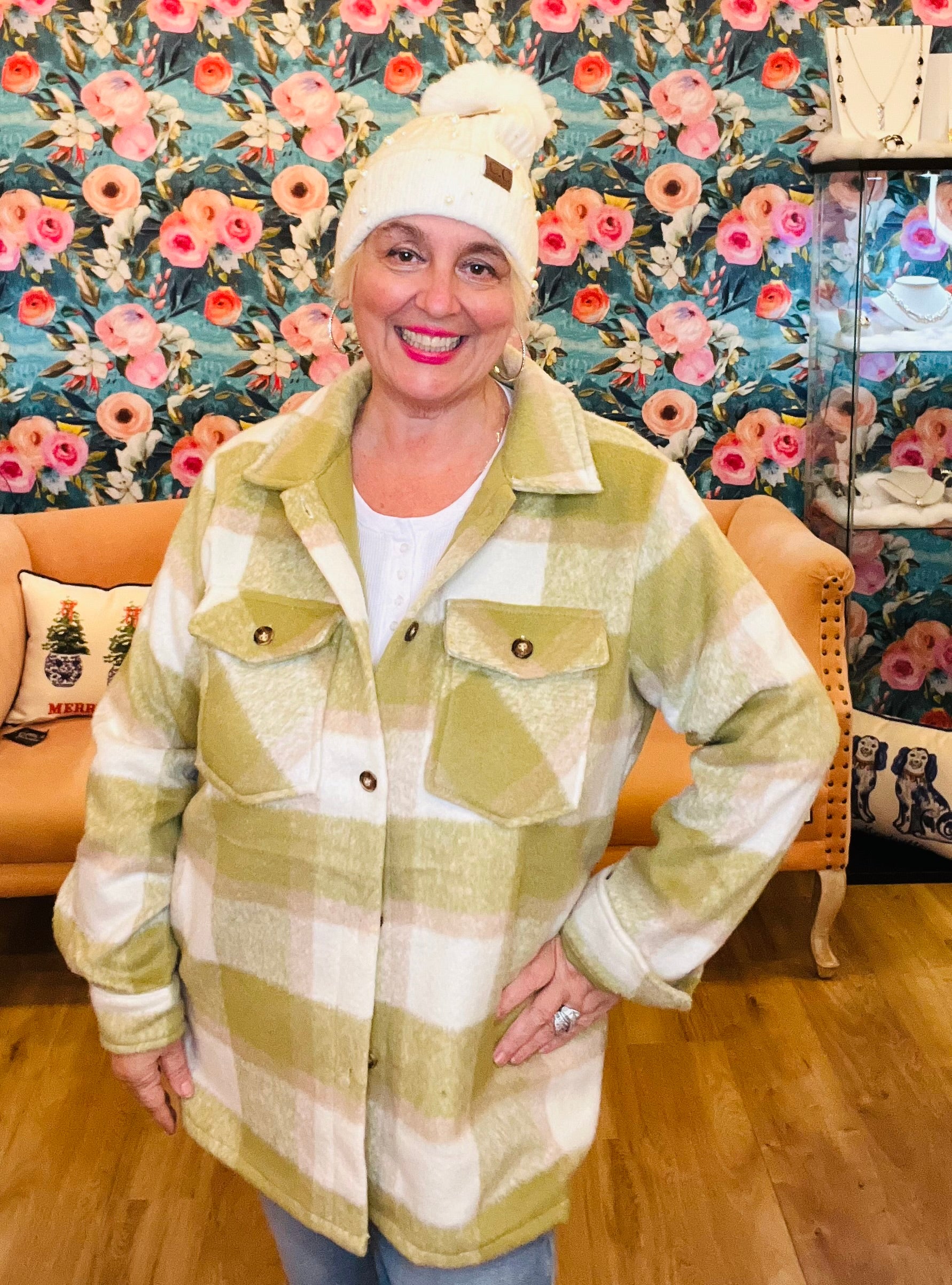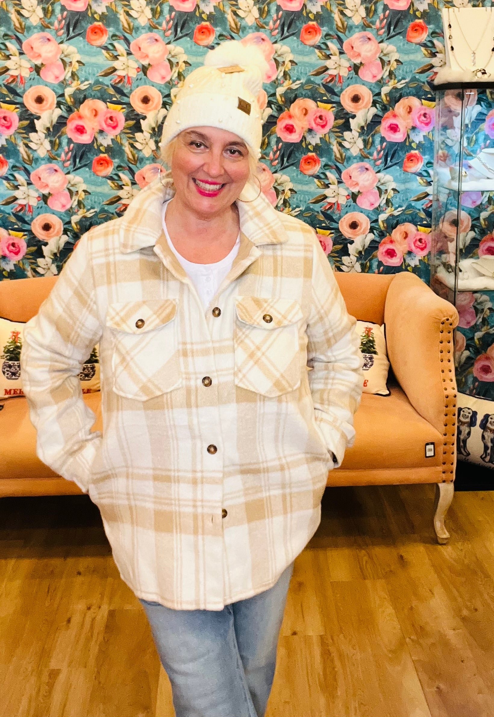 The comfiest jacket of the season! This warm brushed plaid jacket is lined & buttons down the front. It's the perfect stylish winter to coat to wear over your favorite sweaters or blouses!