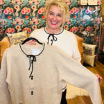 The bow trend is here to stay! This simple button down cardigan has a delicate bow that ties at the neckline. It's bows but classy! Choose from ivory or taupe