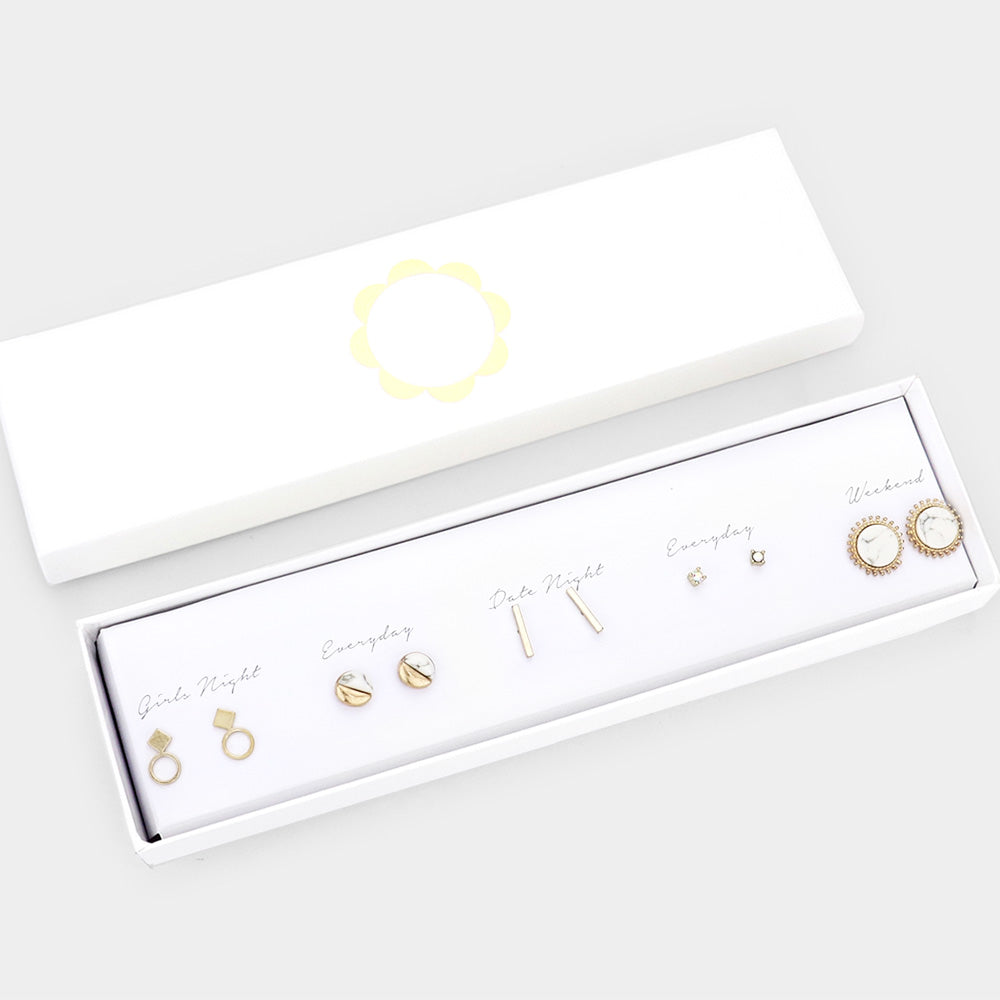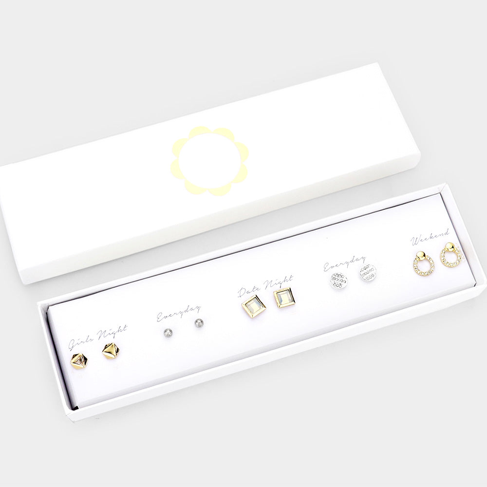 5 pair of earrings for 5 days of the week! This boxed earring set comes with a pair for girls night, everyday, date night, everyday & weekend