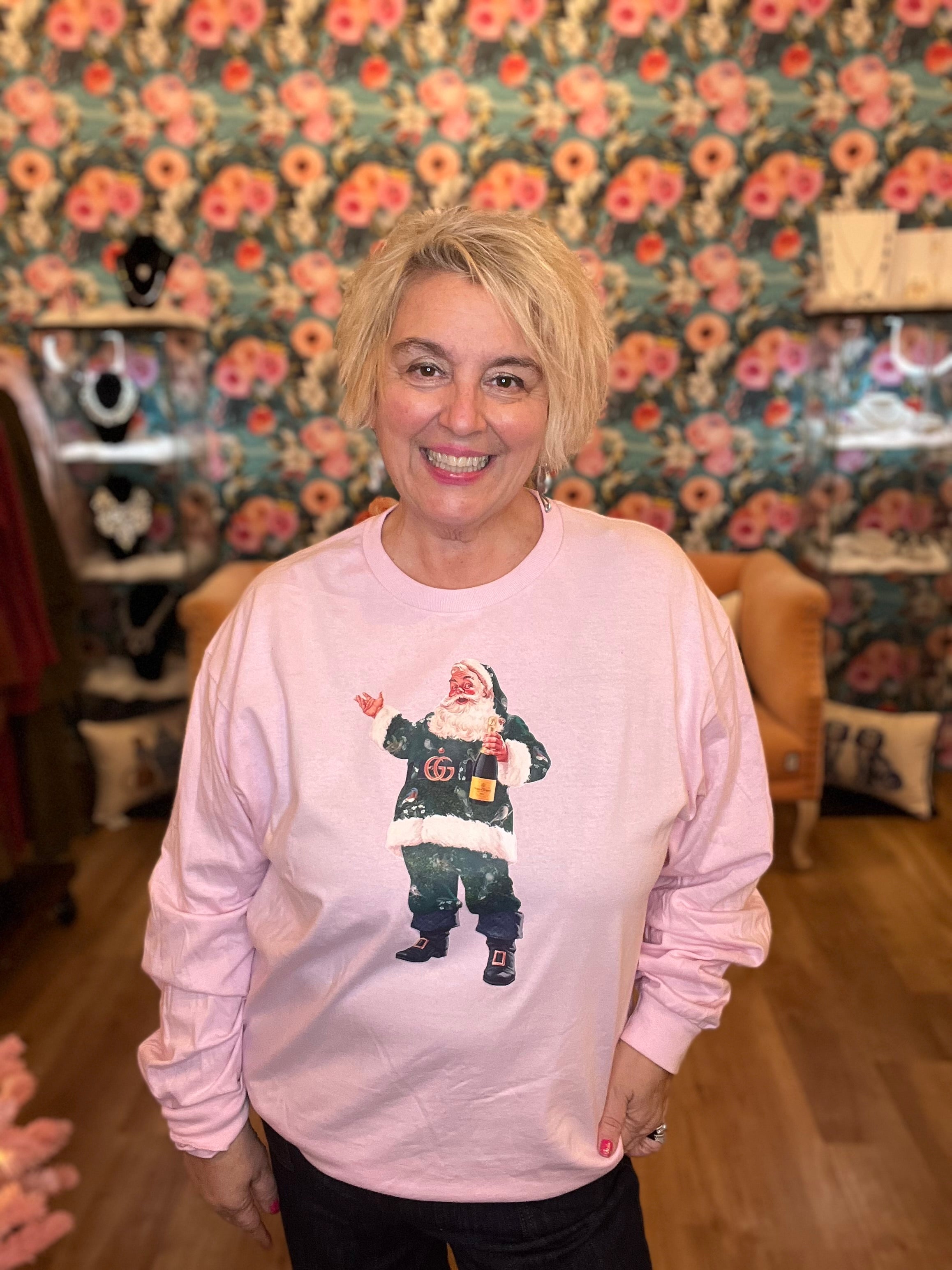 For the boujee gals! This unisex sized long sleeve shirt comes in baby pink & has a G*cci green sequins santa printed on the front popping some bubbly!