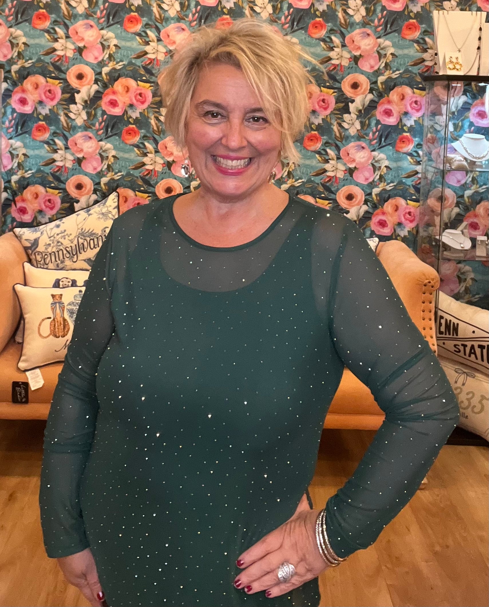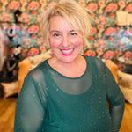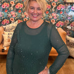 The perfect top to layer under our Vintage Holiday Mesh Duster! This gorgeous green mesh top has rhinestones all over it. Wear it by itself as a knockout stand alone piece!