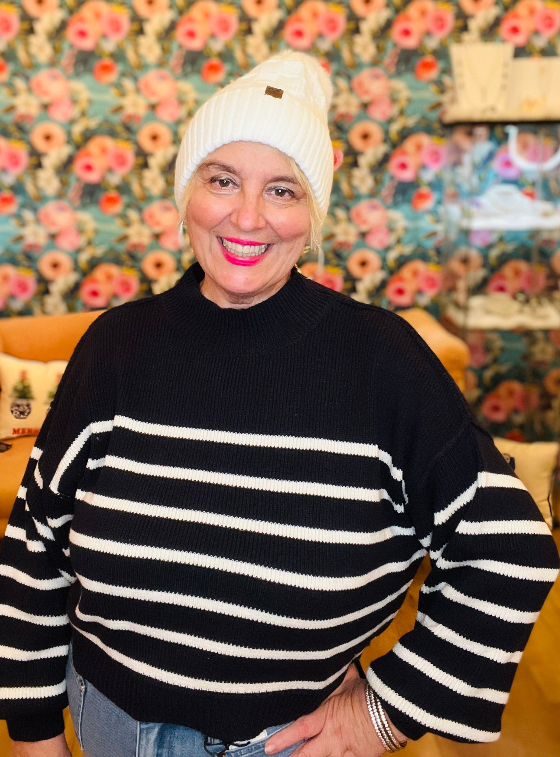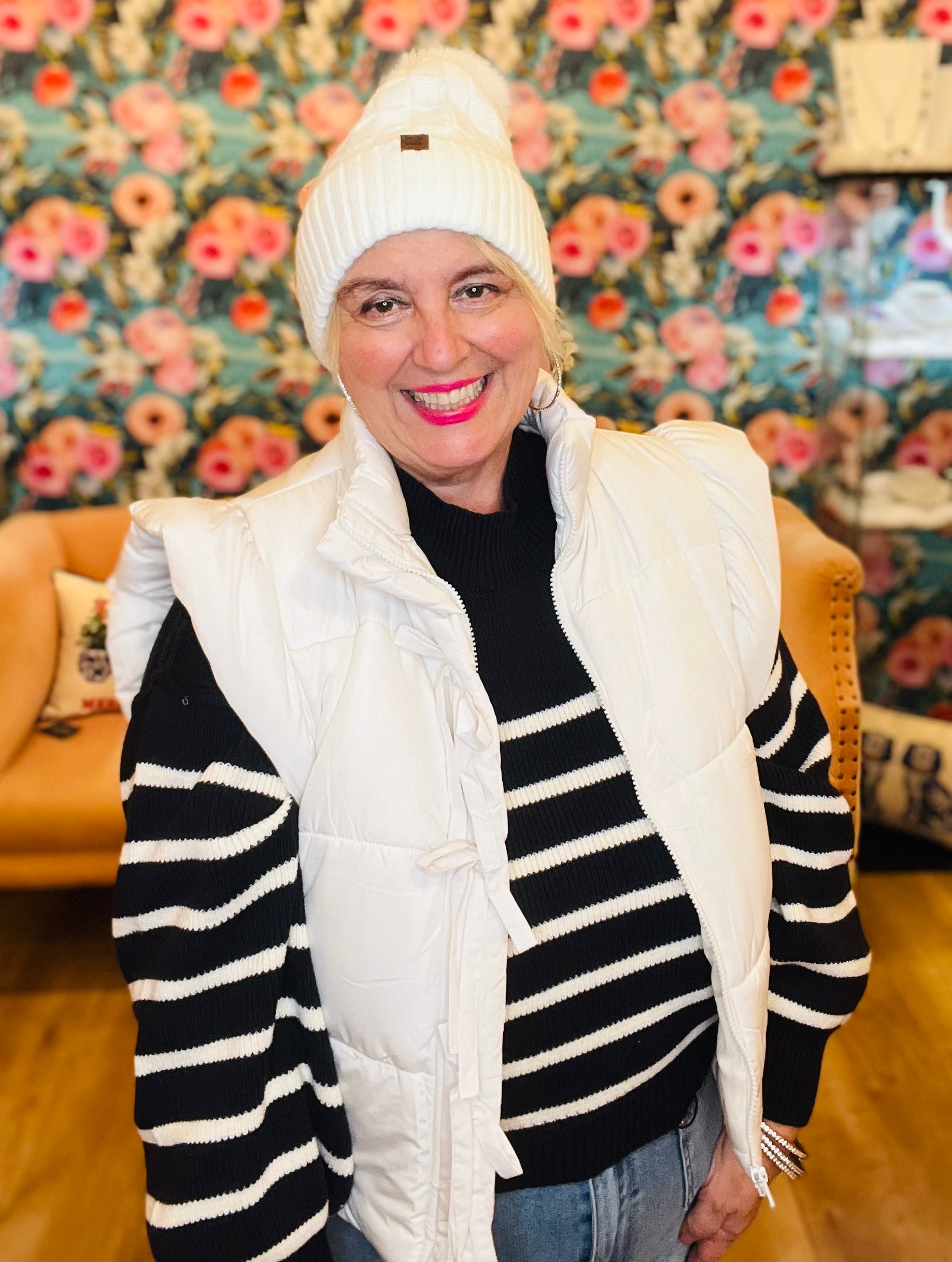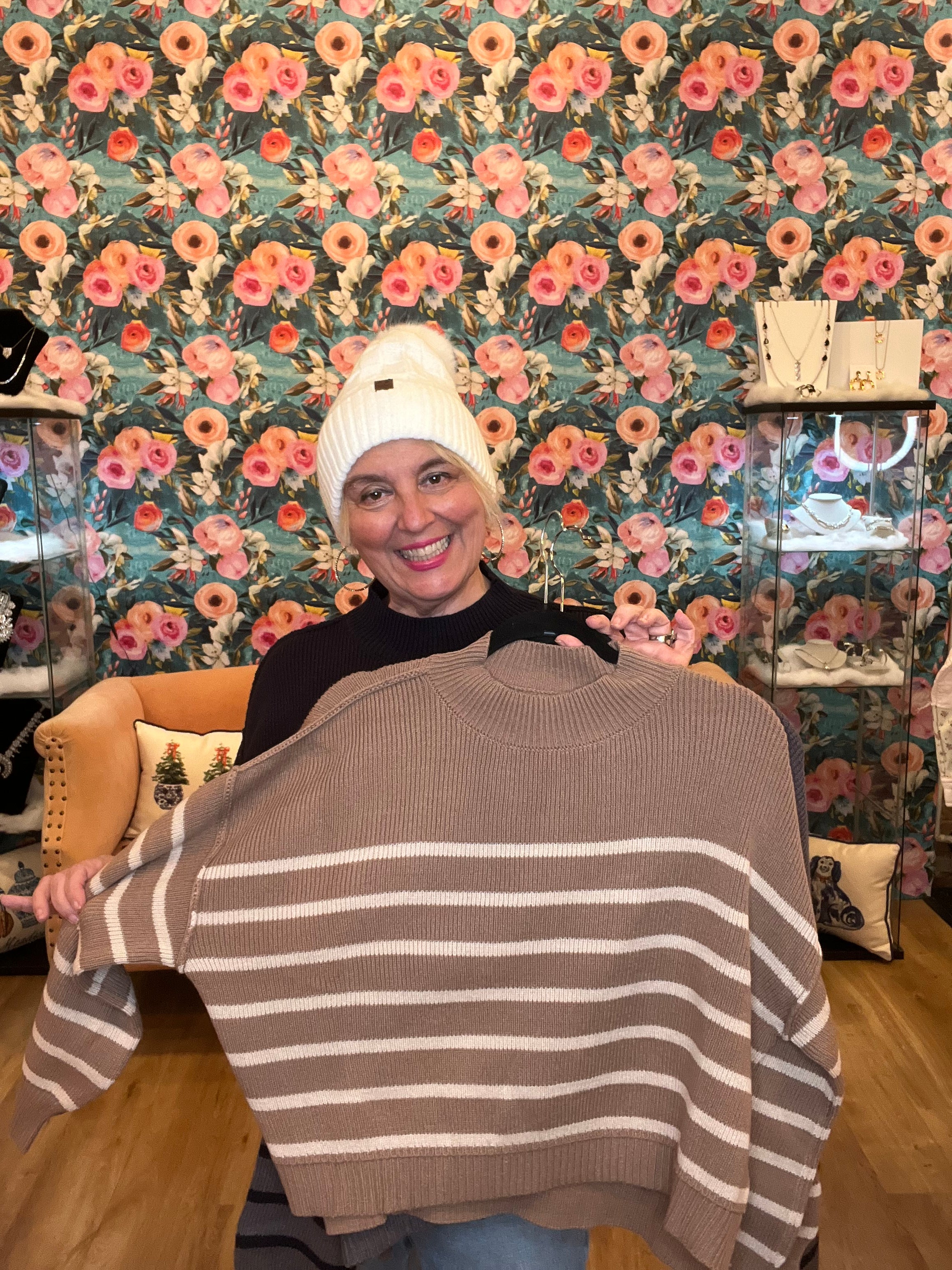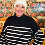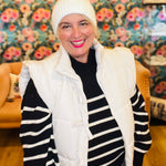 Everyone needs a go to stripe sweater in their closet this fall & winter! Our stripe knit sweater by Blu Pepper is comfortable, roomy & cozy. Pair it with our matching ruffle vests for a great set!