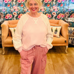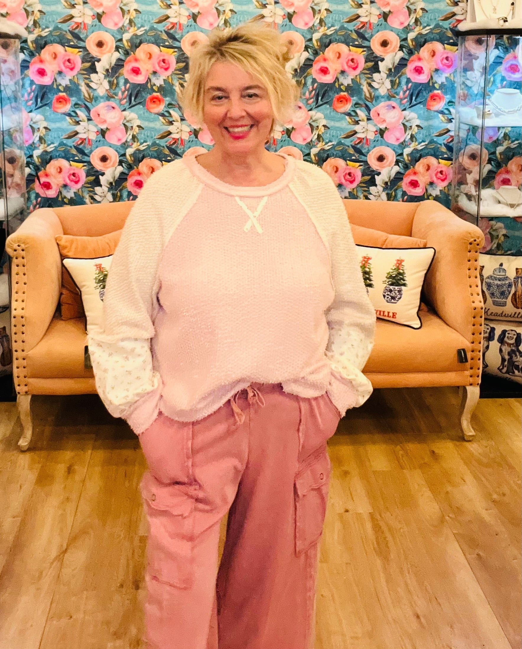 This wide leg terry knit cargo pants have a mineral wash to make them look a little distressed. There are multiple pockets on these pants with a drawstring on the elastic waistband. With the raw hemming throughout makes this a very casual pant.