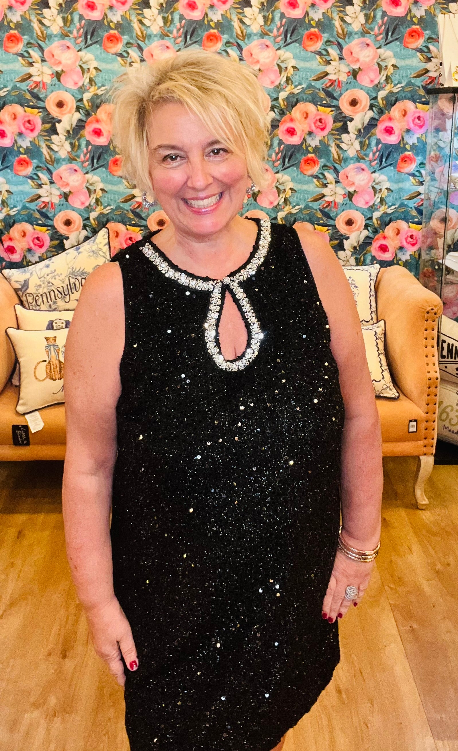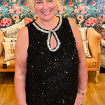 Our favorite in the lineup for this year's holiday dress! This gorgeous sequin textured dress will make you feel like royalty. It has a sequins studded keyhole and little silver sequins throughout the bodice