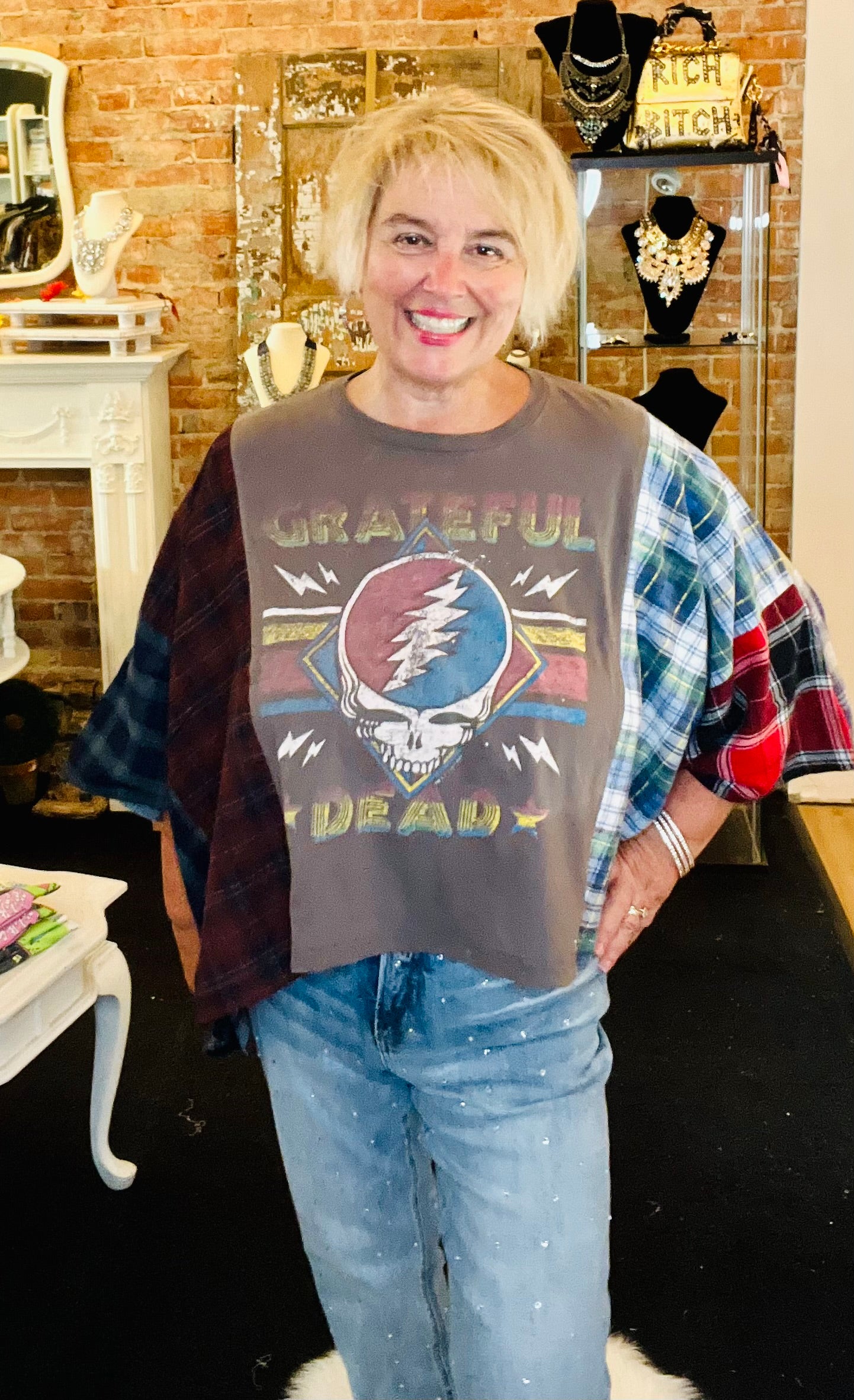 These interesting pieces are made by deconstructing flannel shirts and then combining them with our upcycled denim and 100% cotton handknits. Each piece is one-of-a-kind. This diverts it from the landfills and gives it new life.