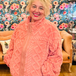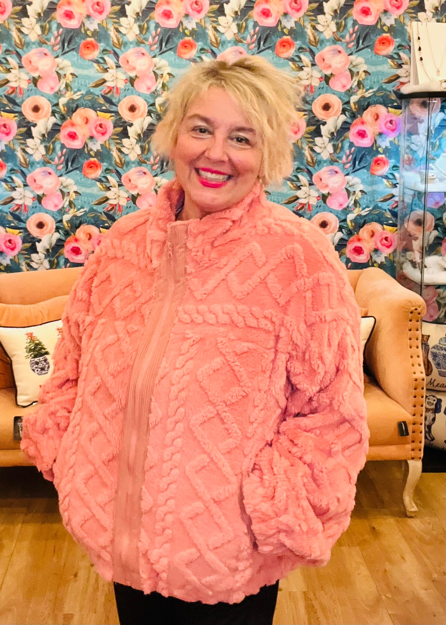 Bundle up this winter! This cozy sherpa jacket has a fun zigzag pattern & zips up the front. It's great for lounging around the house or fighting off the cold outside!