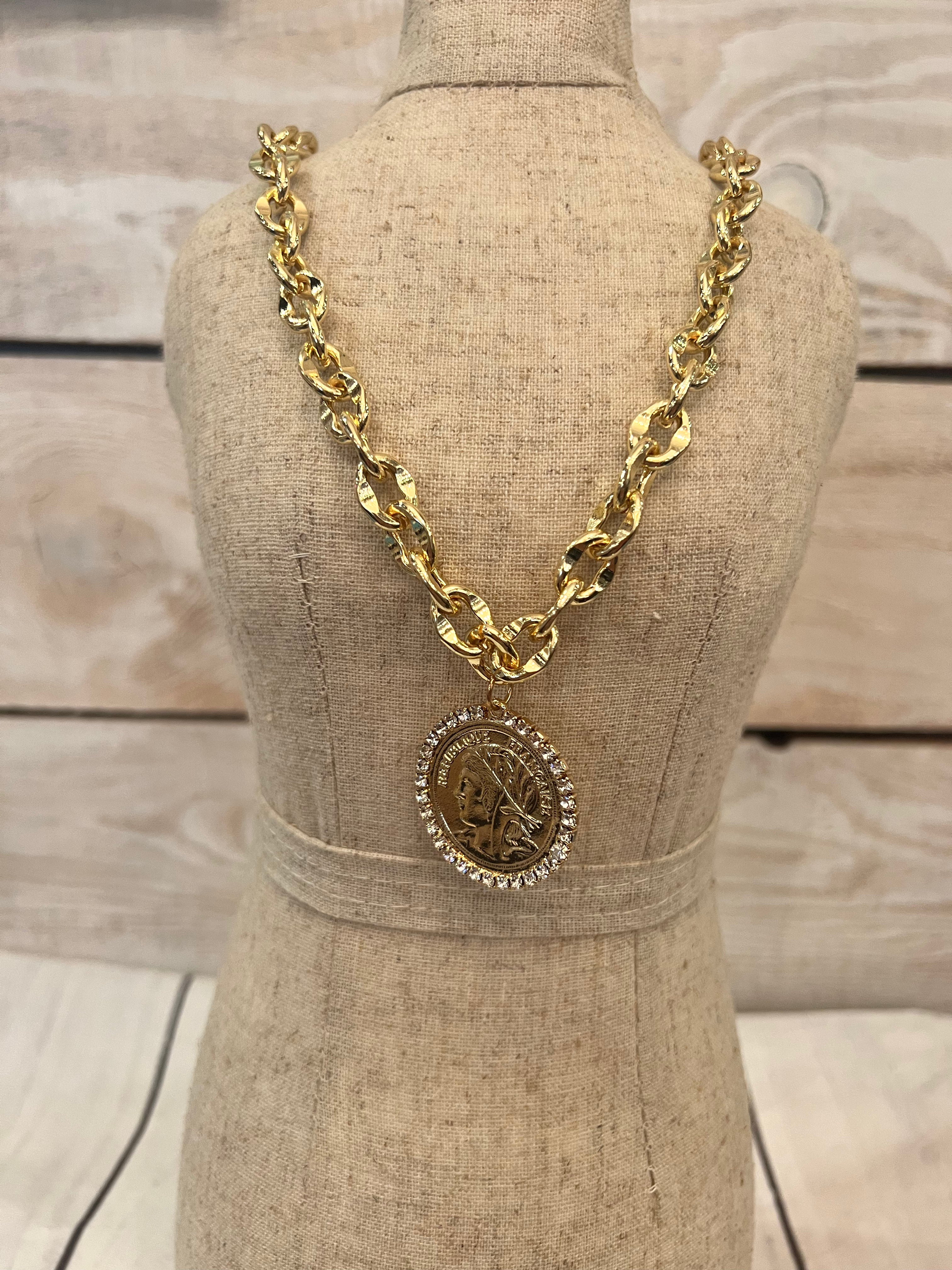 If you like statement pieces then this necklace is for you! This gold coin necklace has a rhinestone trimmed coin & a thick link chain
