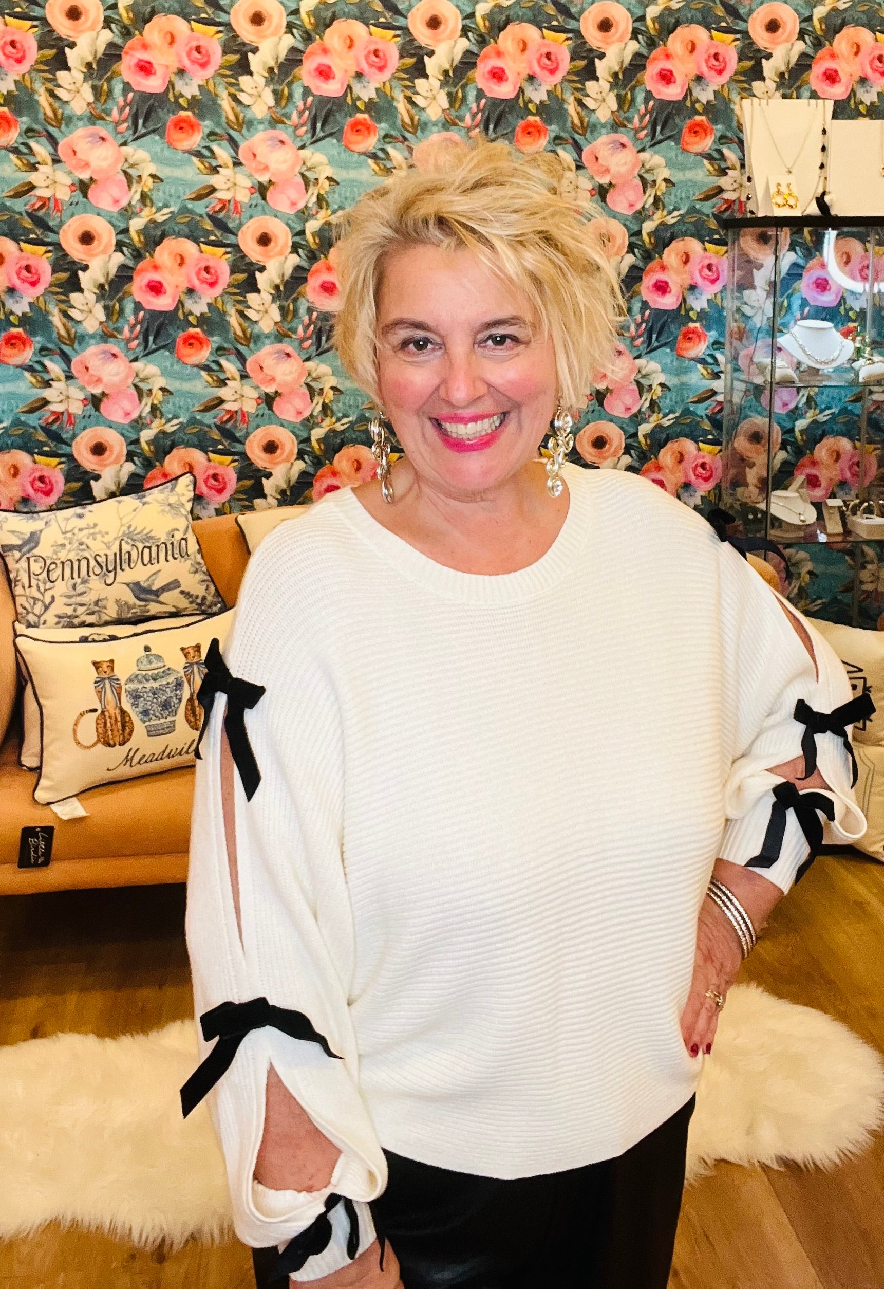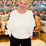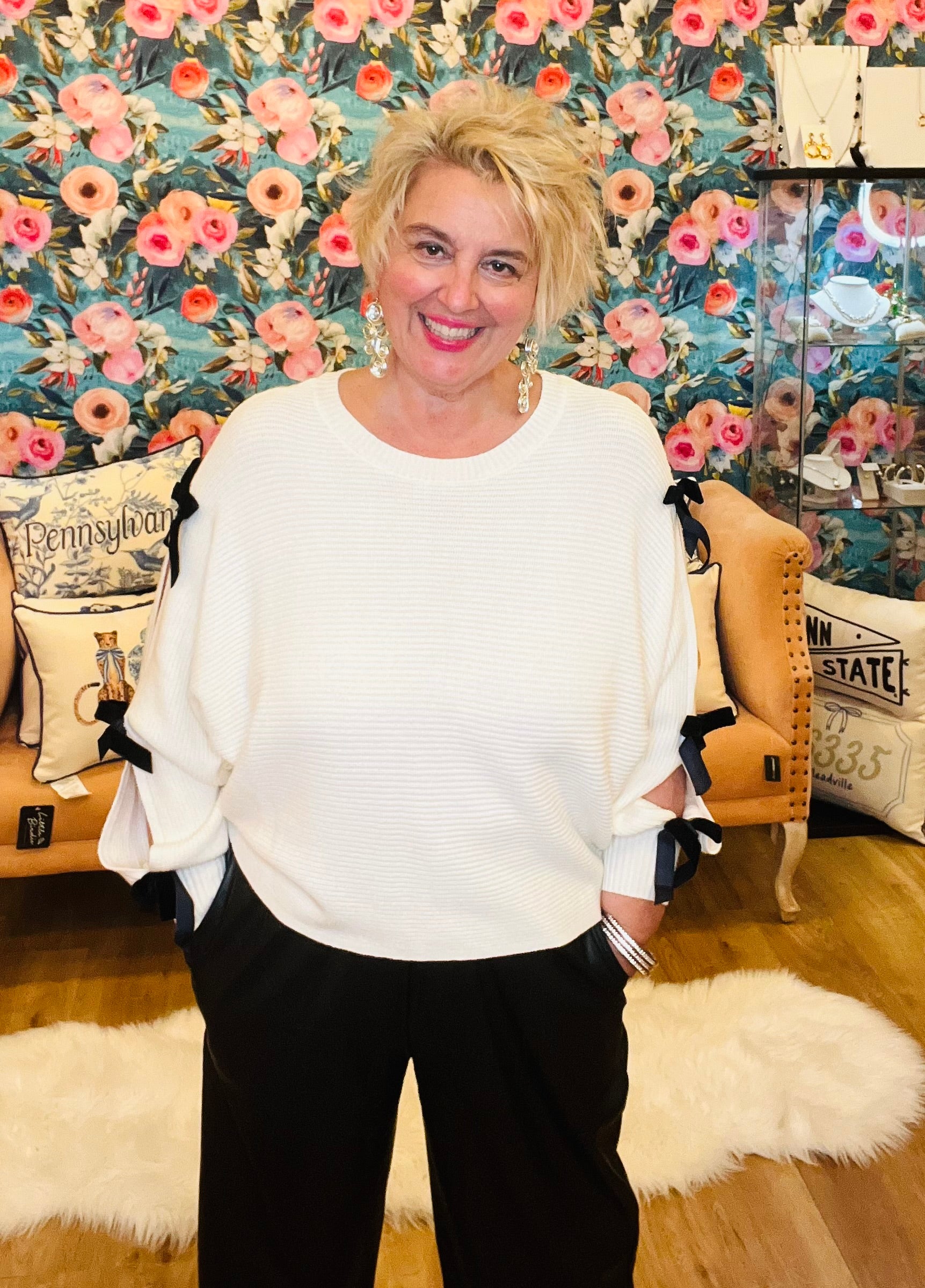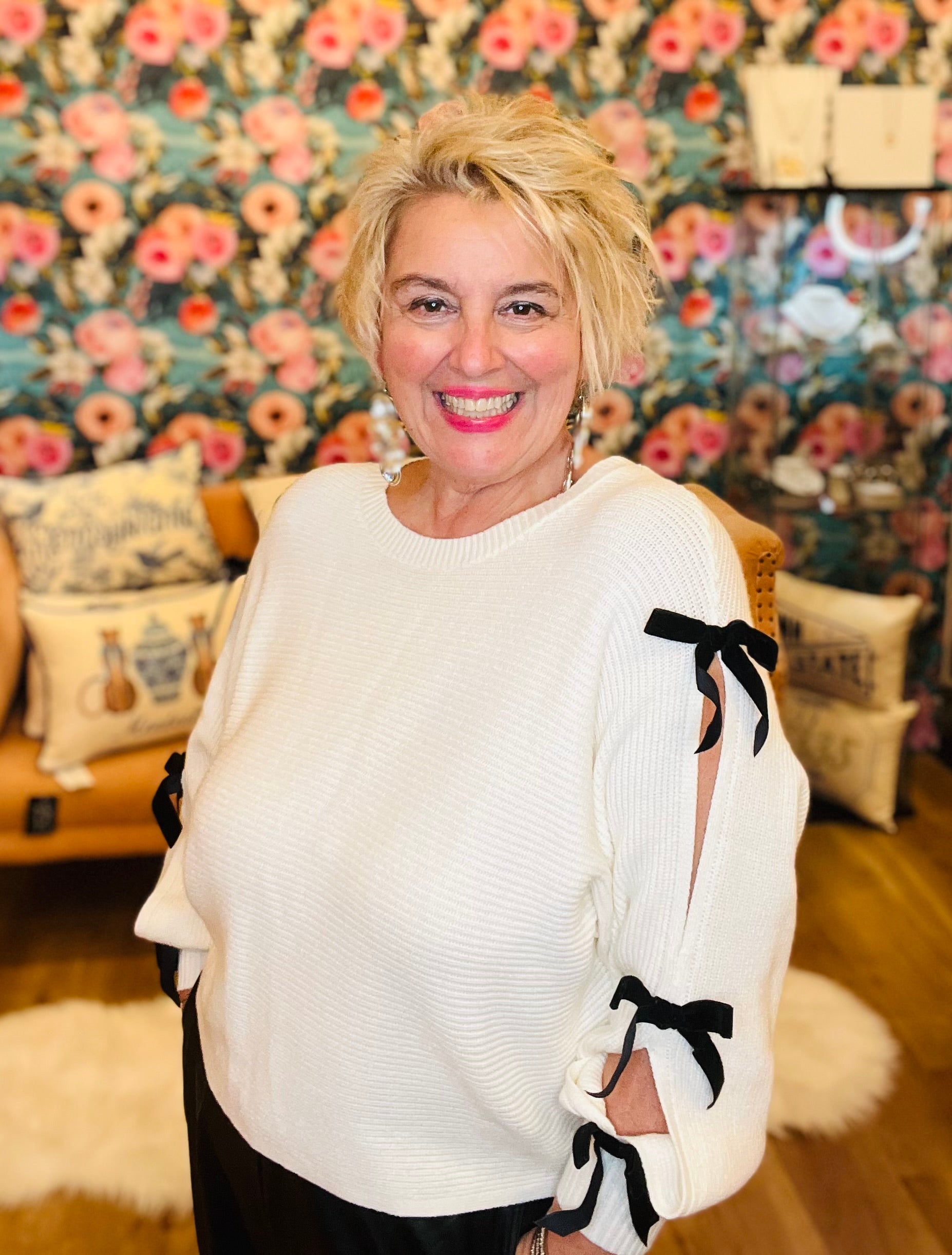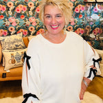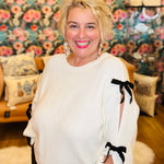 GURRRRLLLLL This super soft sweater is perfect to transition through the cooler months, PLUS it has a little cute details with the bows down the side of each arm.
