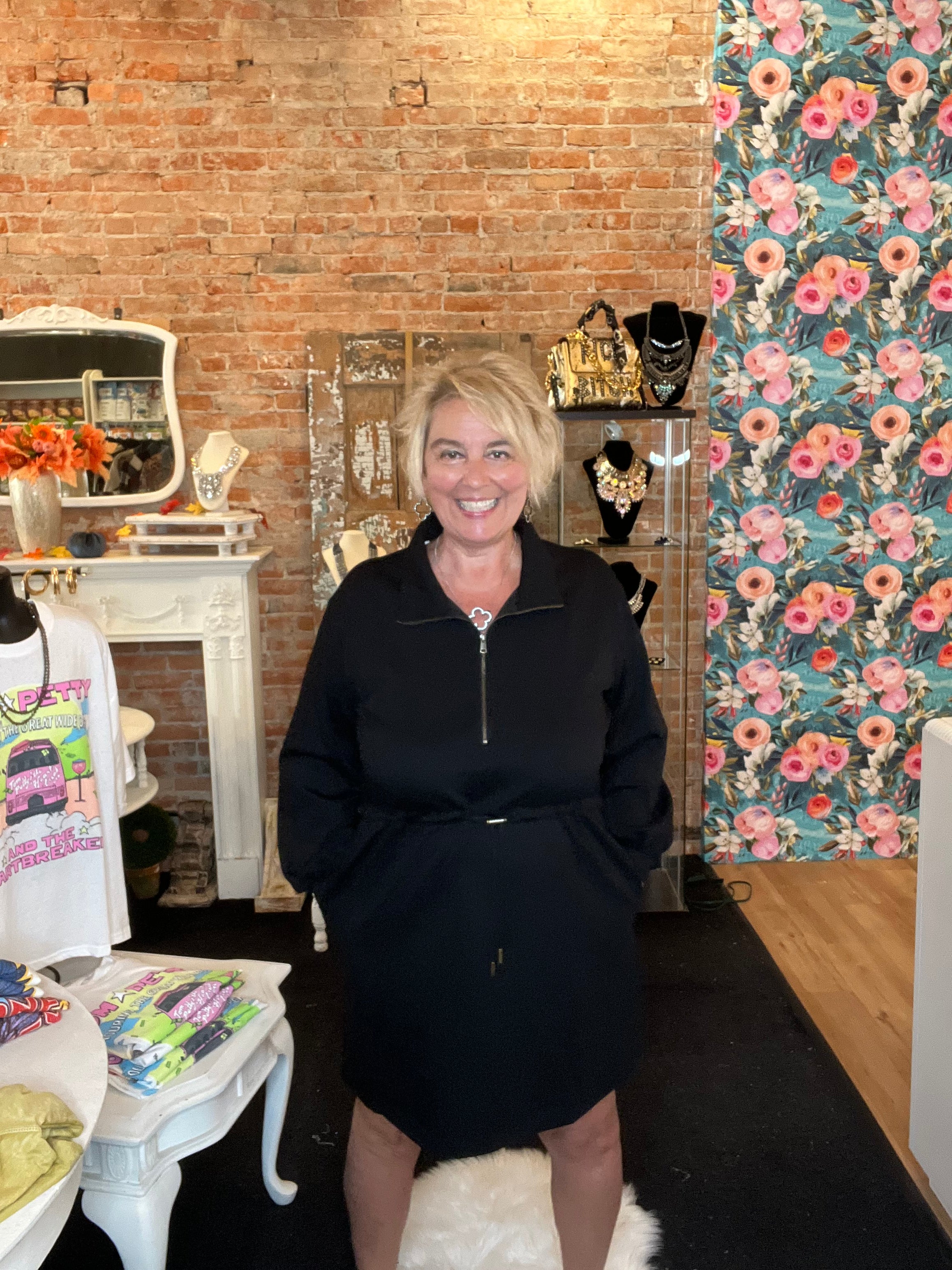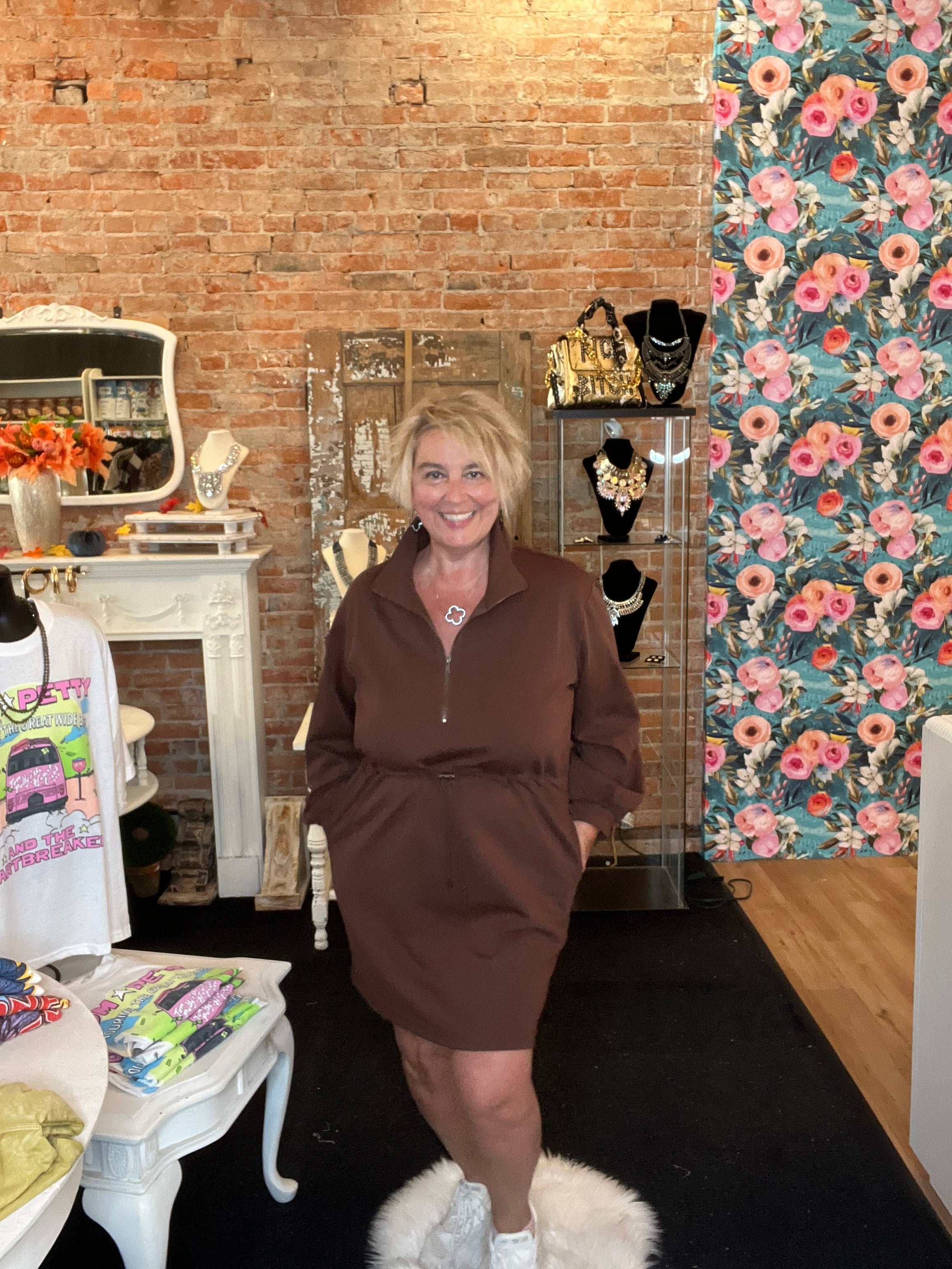 The perfect throw it on & go dress! This buttery soft scuba fabric has a drawstring adjustable waist & zippered neckline. Grab your sneakers & get those errands done while looking fabulous!