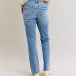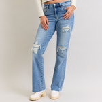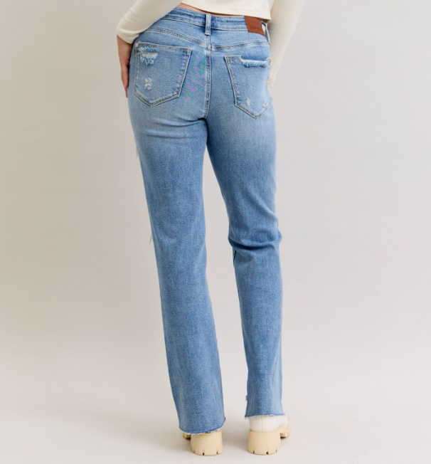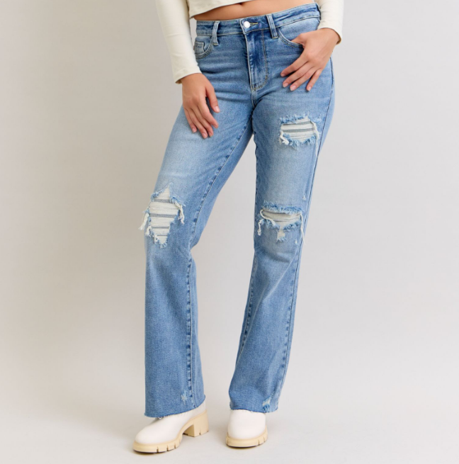 Jeans with a 90s vibe! The Lizzie jean is a mid rise straight leg with distressed patches on the front. Size down! Size 6 goes to 5, 4 goes to 3, etc.