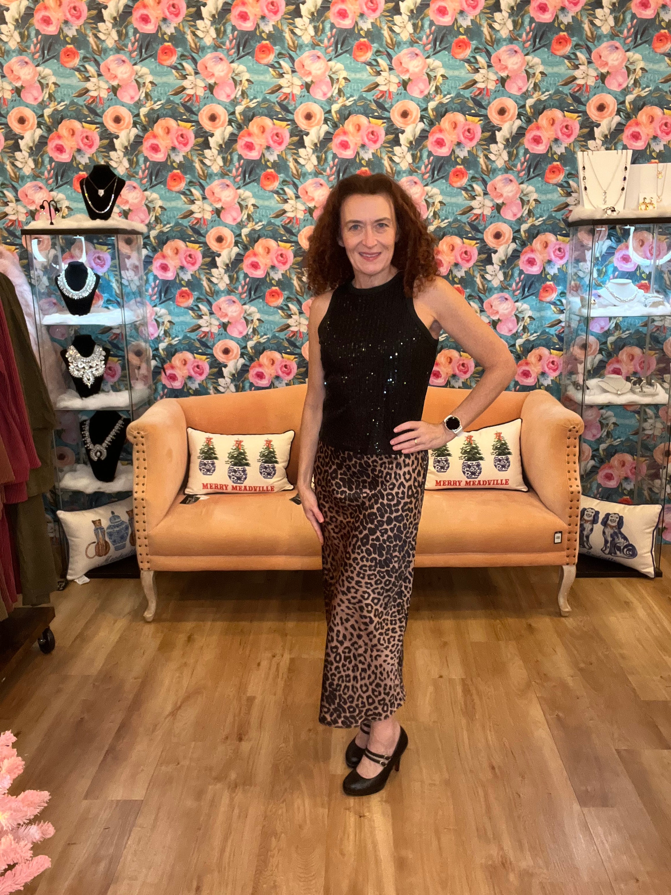 Feel fierce in this new leopard satin skirt! Pair it with a black sweater or velvet blazer for fall into winter. It has an elastic waist for easy pull on & is midi length - perfect for boots!