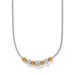 Simple bead necklace with 6 beads and center pave barrel on a square link fine chain. Look for the matching hoop earrings made with hand strung beads to match. Lightweight and special.