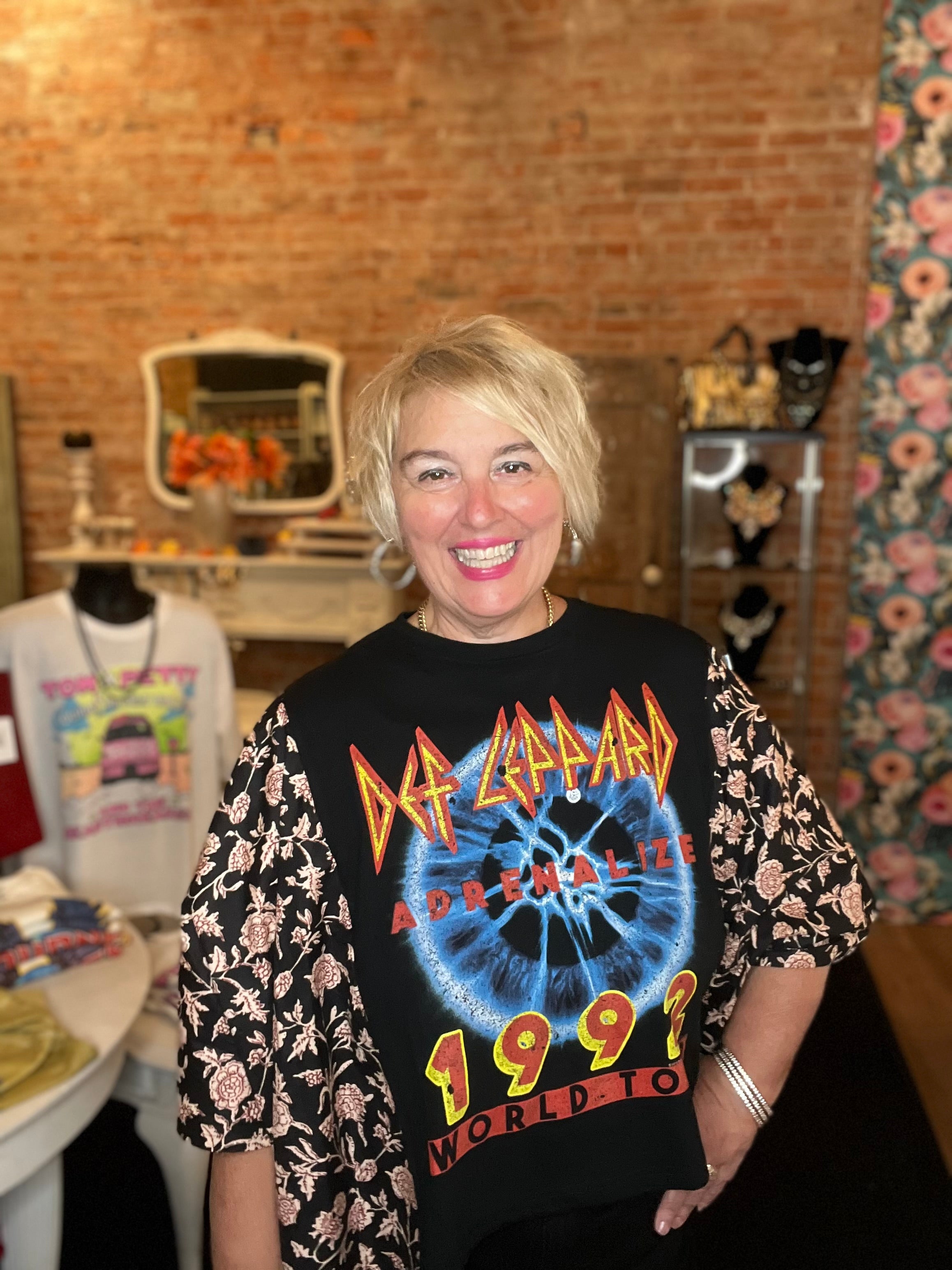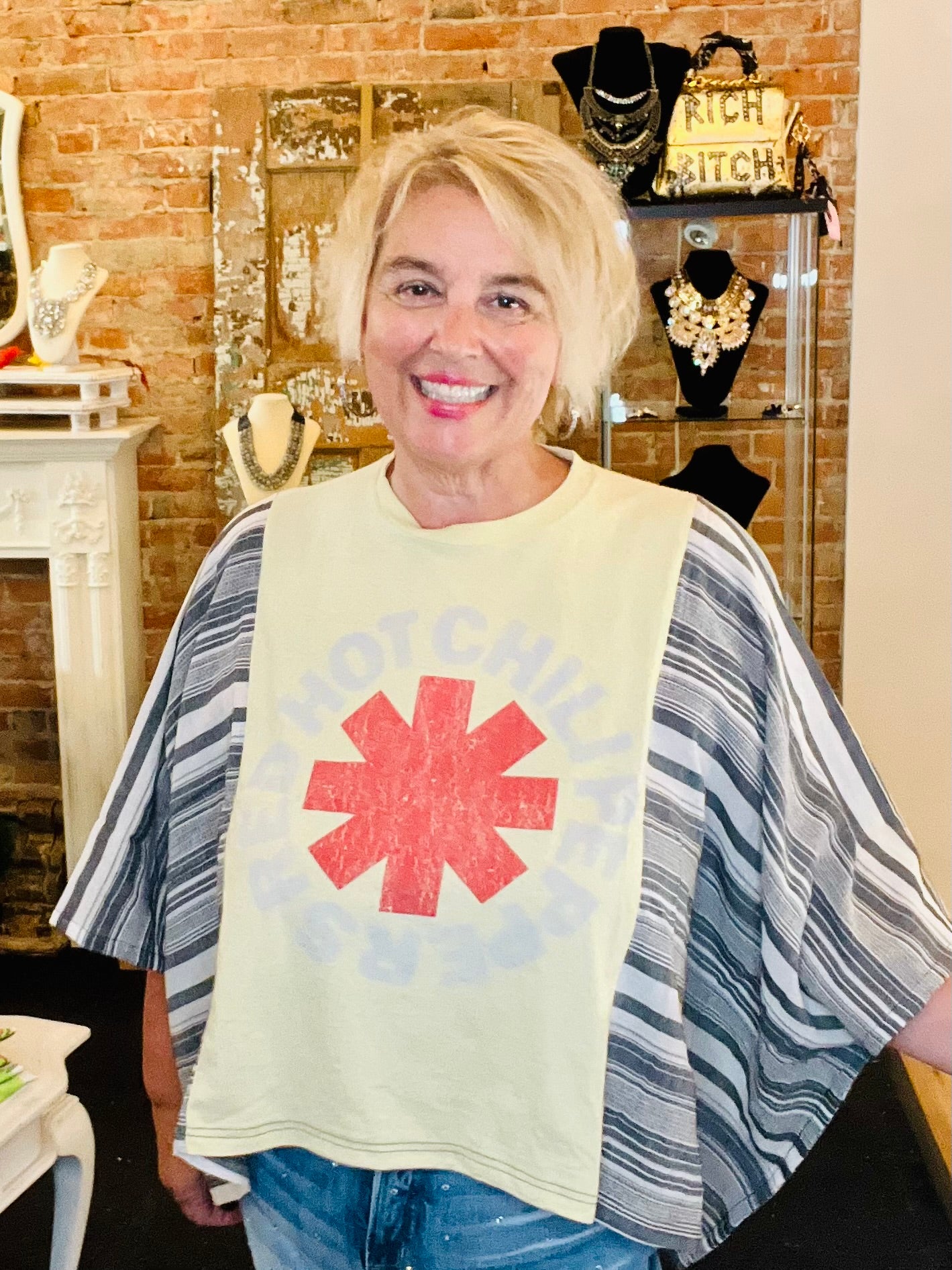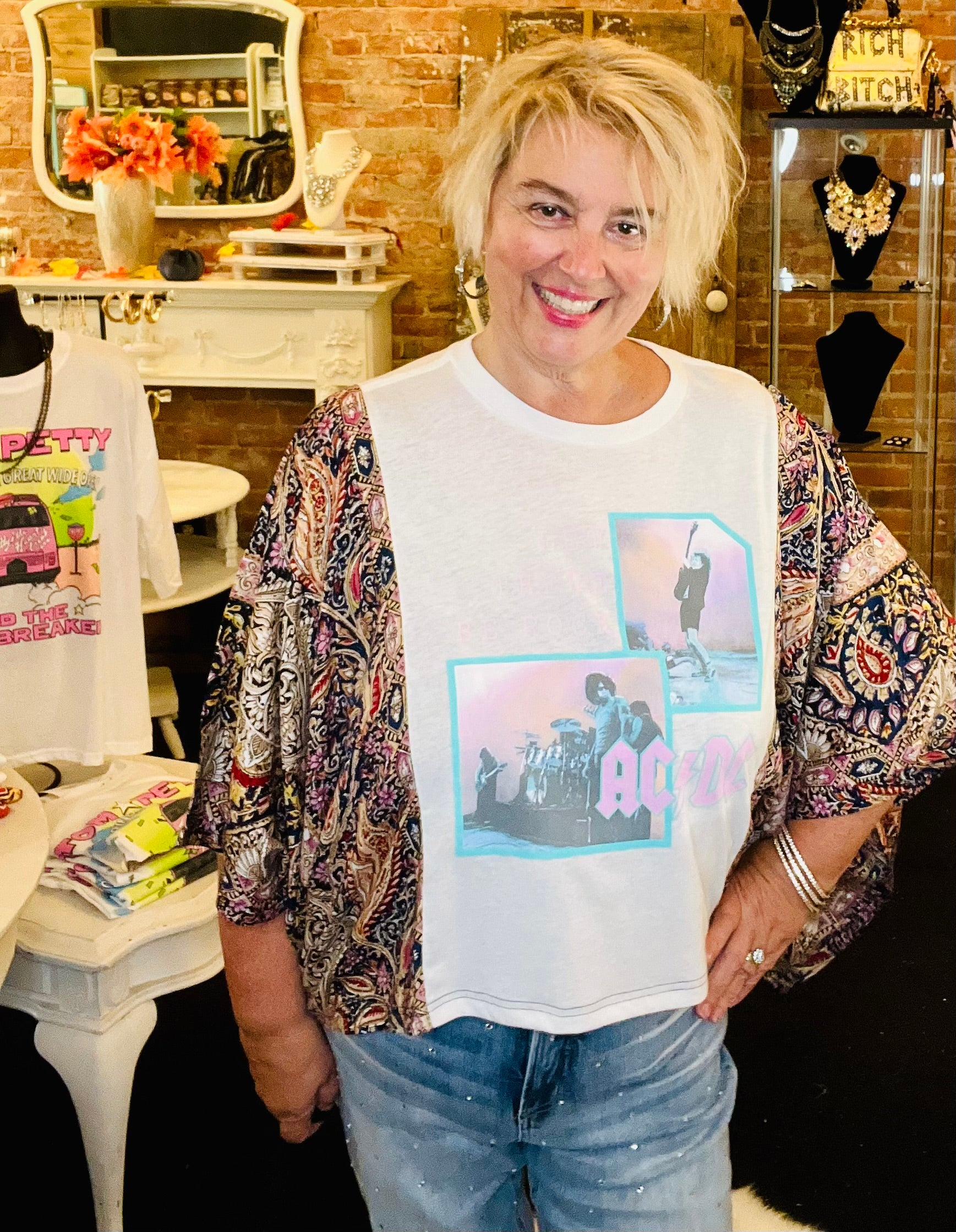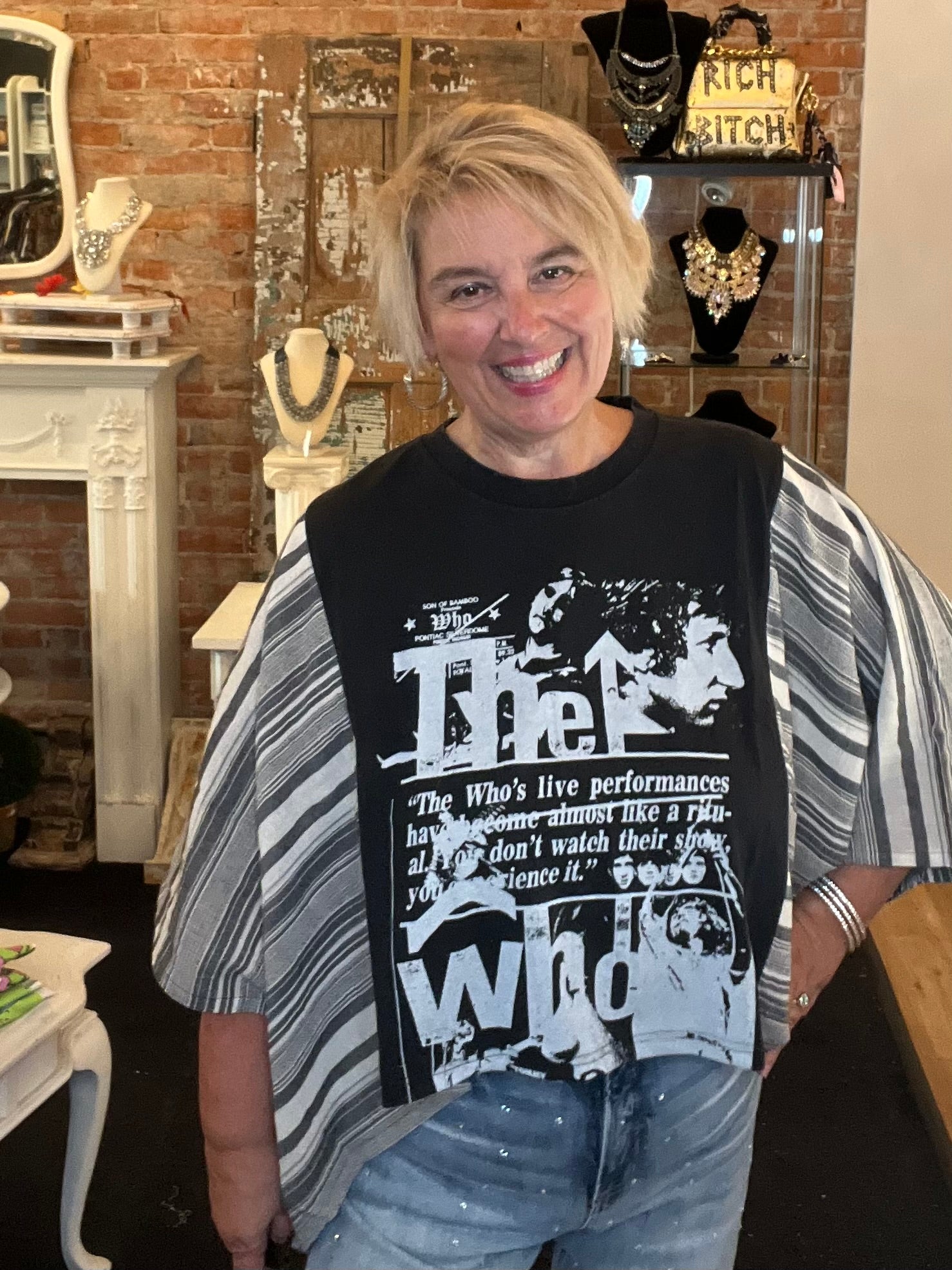 These pieces have been made using upcycled Rock band tees, each piece is one-of-a-kind and designed combining deconstructed vintage denim and upcycled band tees. This diverts it from the landfills and gives it new life.