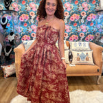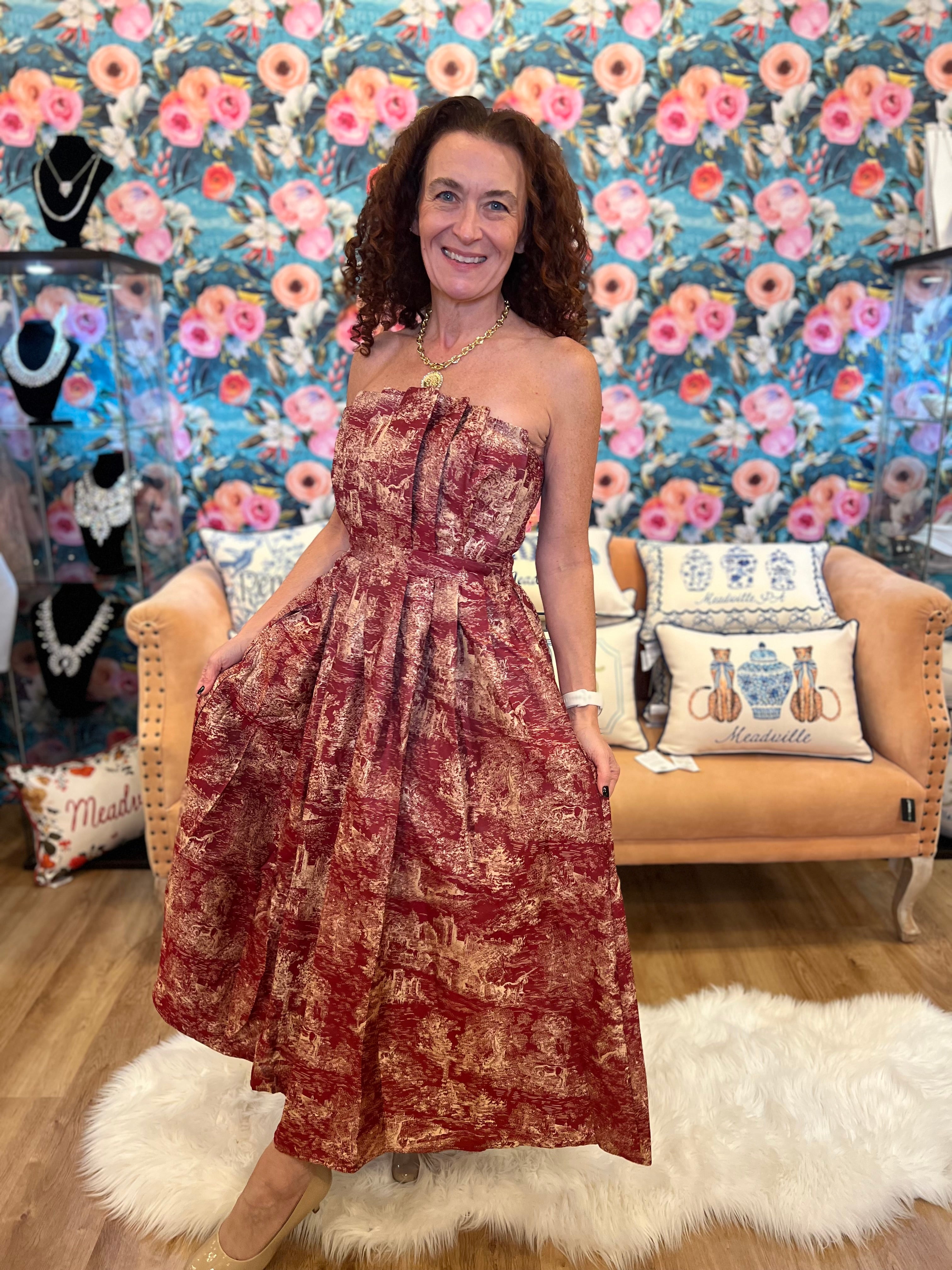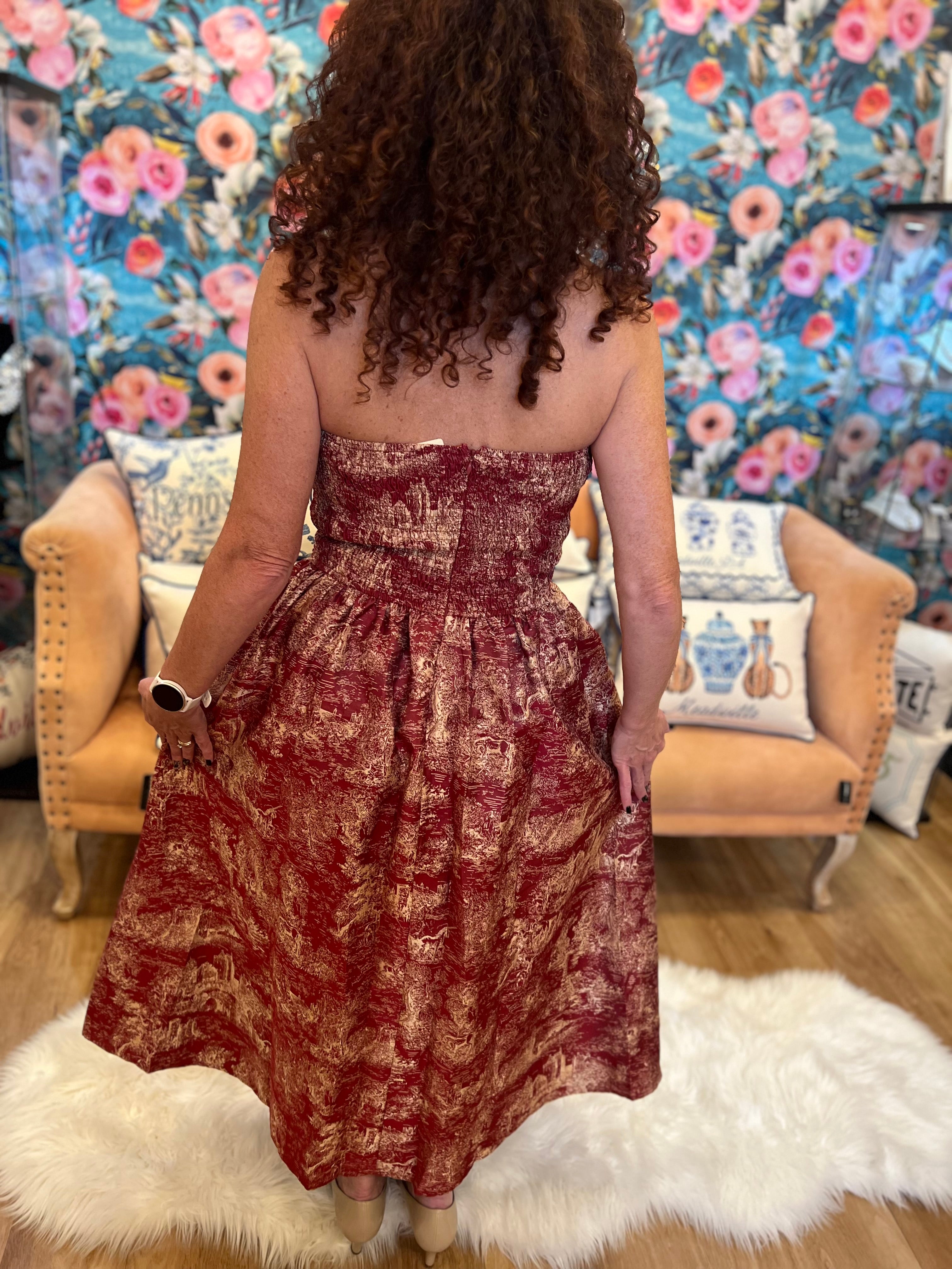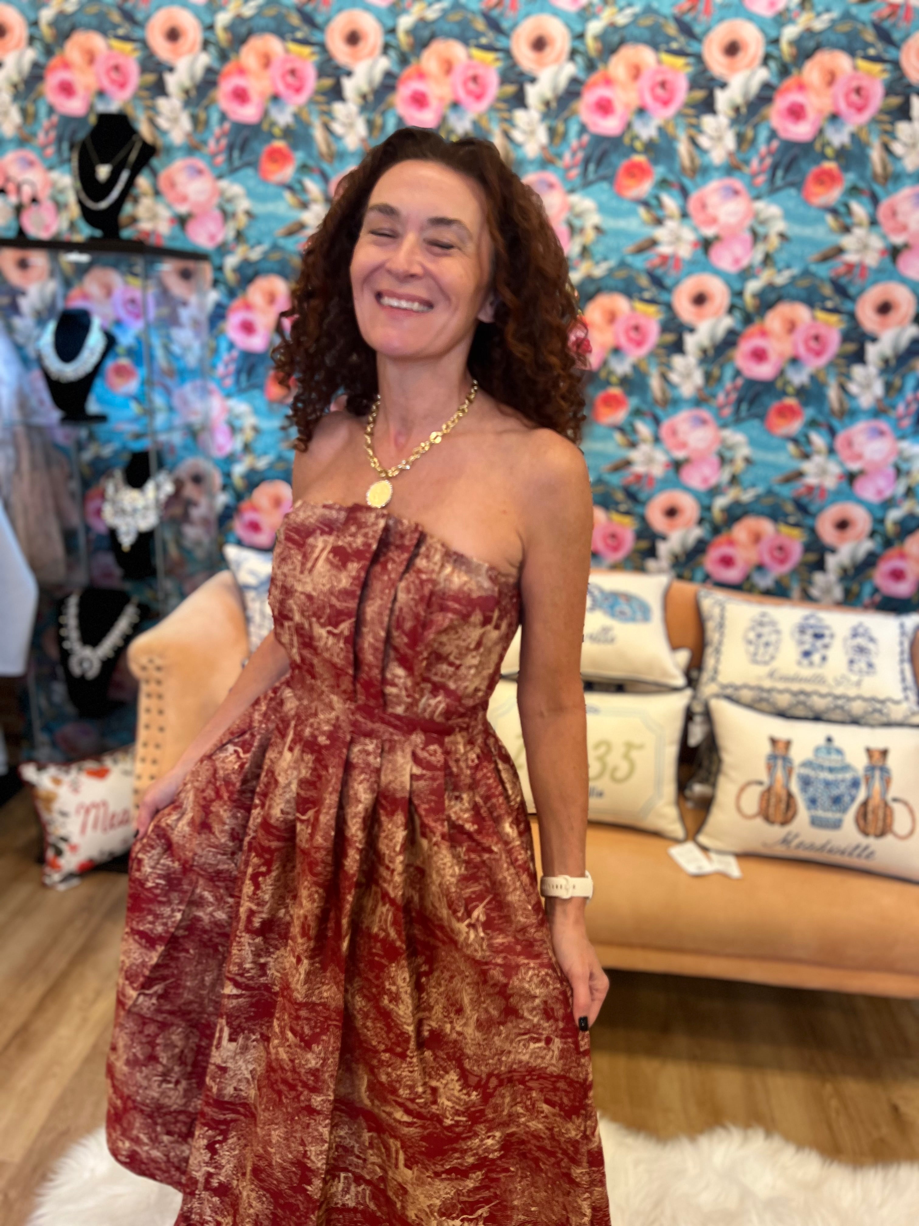 This dress is perfect for a Christmas or winter wedding! The gorgeous gold printed design is elegant & stunning. Grab your gold heels & glittery handbag - you'll be the talk of the event!