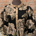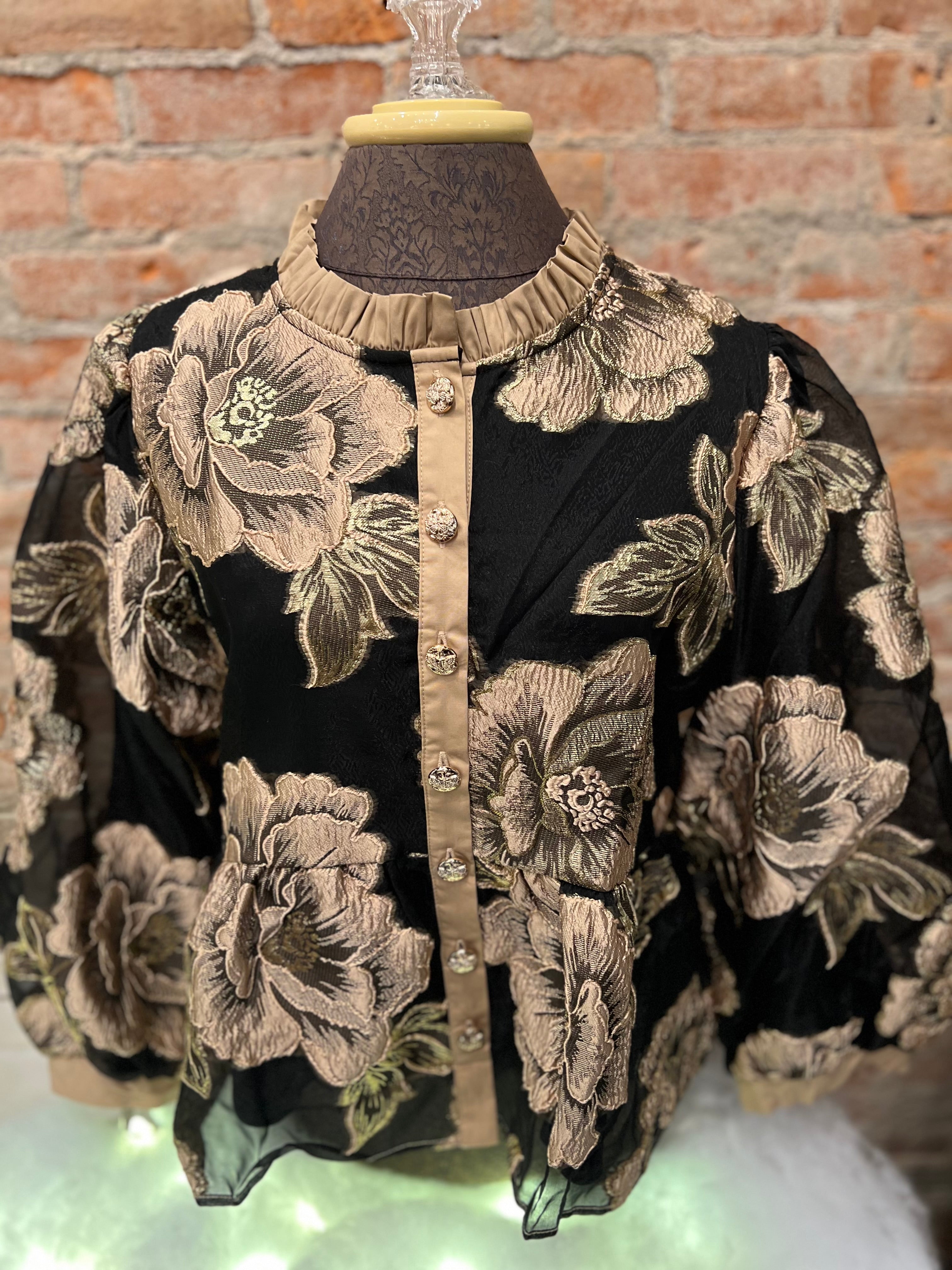 This might be our favorite top we have in the store! This puff sleeve blouse by Entro as stunning metallic gold/silver details in the flowers & on the buttons. It's the perfect top for work or pair it with a black velvet skirt for your next holiday party!