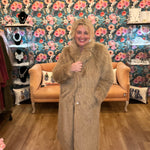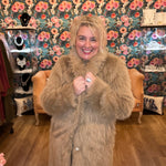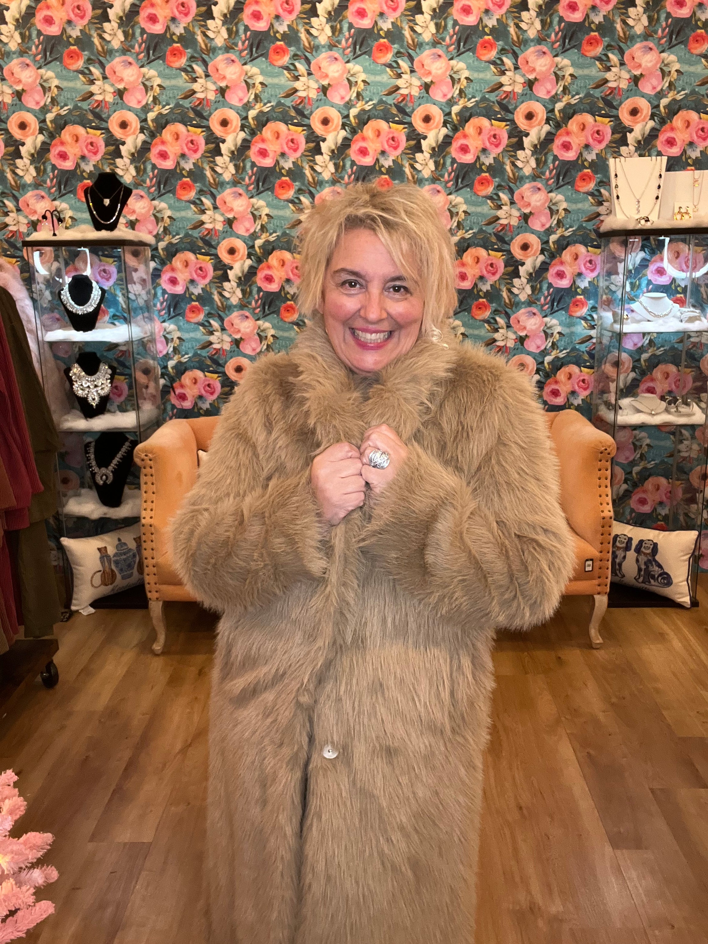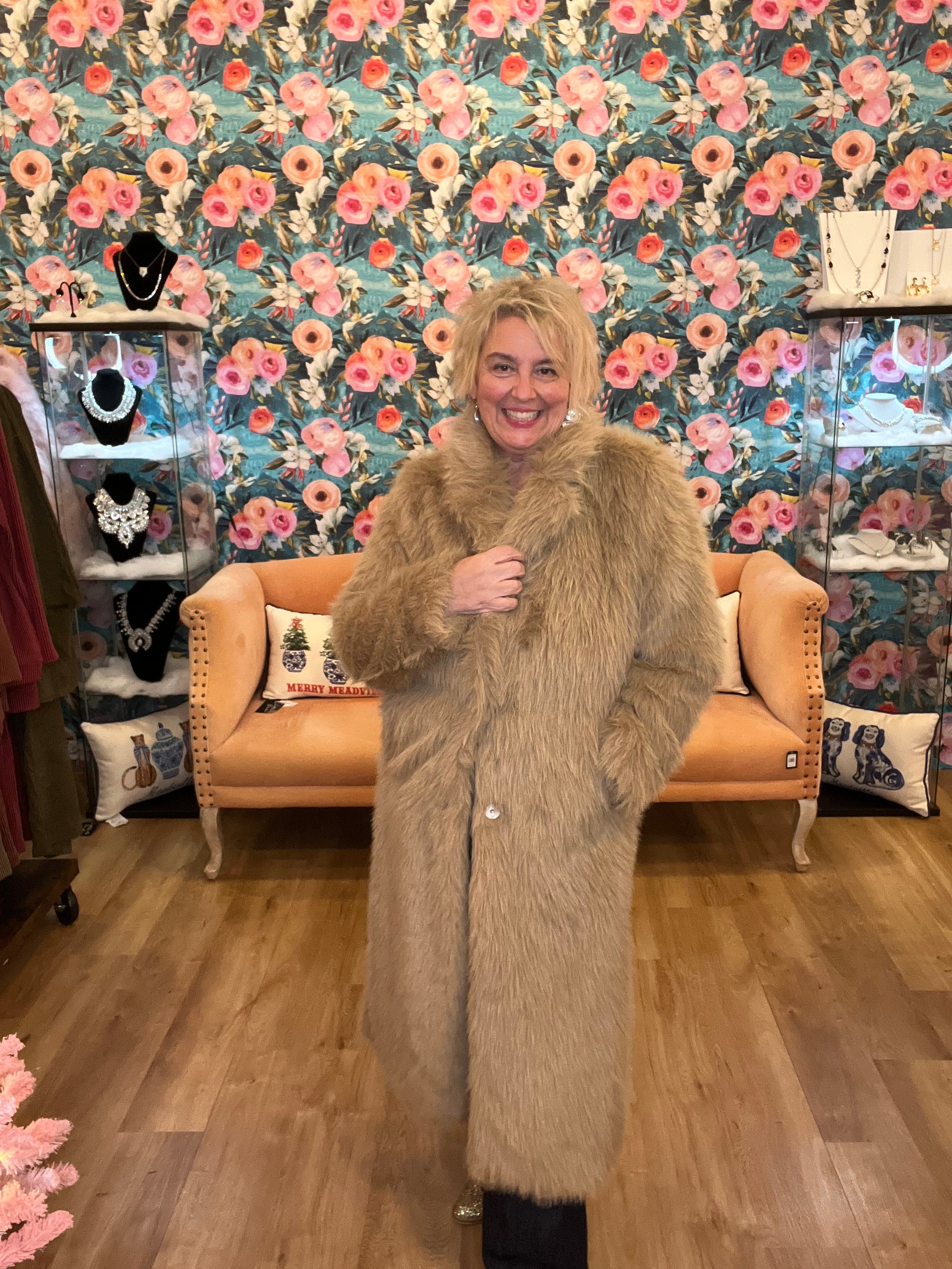 Can you say rich? This faux fur coat will make you feel like a celebrity walking the streets of NYC! It comes in a gorgeous tan color & is lines with a satin horse pattern that is so unique!