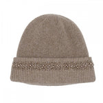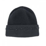 Add a touch of girly to your winter beanie! This knit beanie folds over & has rhinestones & pearls embellished on the fold