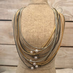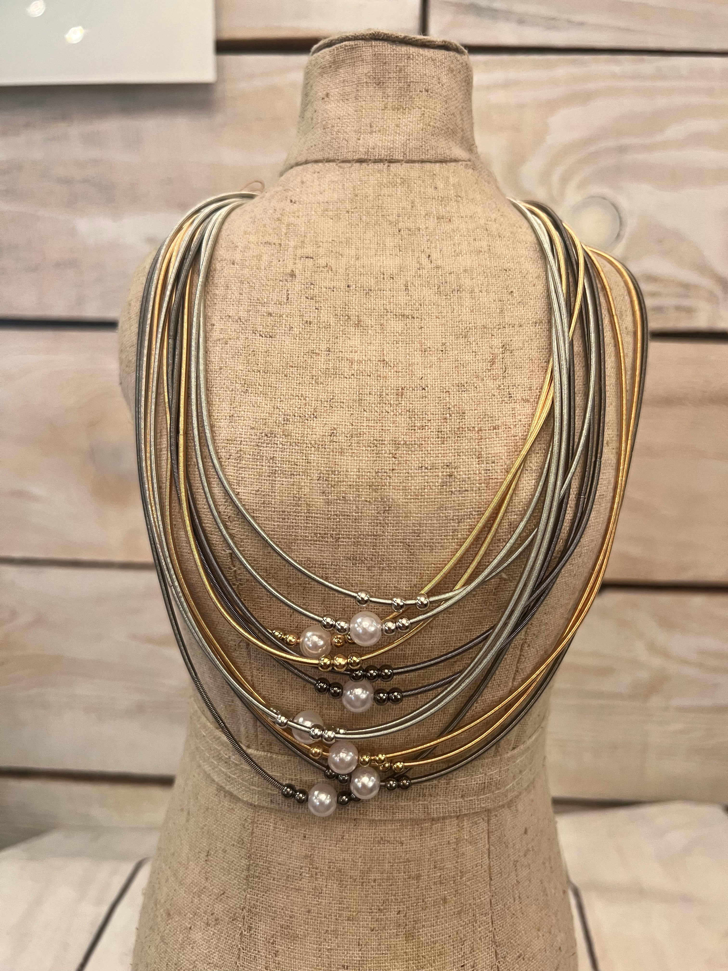 Pretty in pearls! This tri tone necklace has little pearls & beads on each strand. It comes with matching pearl drop earrings!