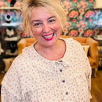 The cutest top we've seen all season! This casual top by Easel has a peter pan ruffle collar with little rosebud details. It would look so cute with tan pants from fall into spring!