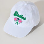 Features a crisp white color with the word "Baller" and a pair of pickleball paddles embroidered in green, pink, and navy
