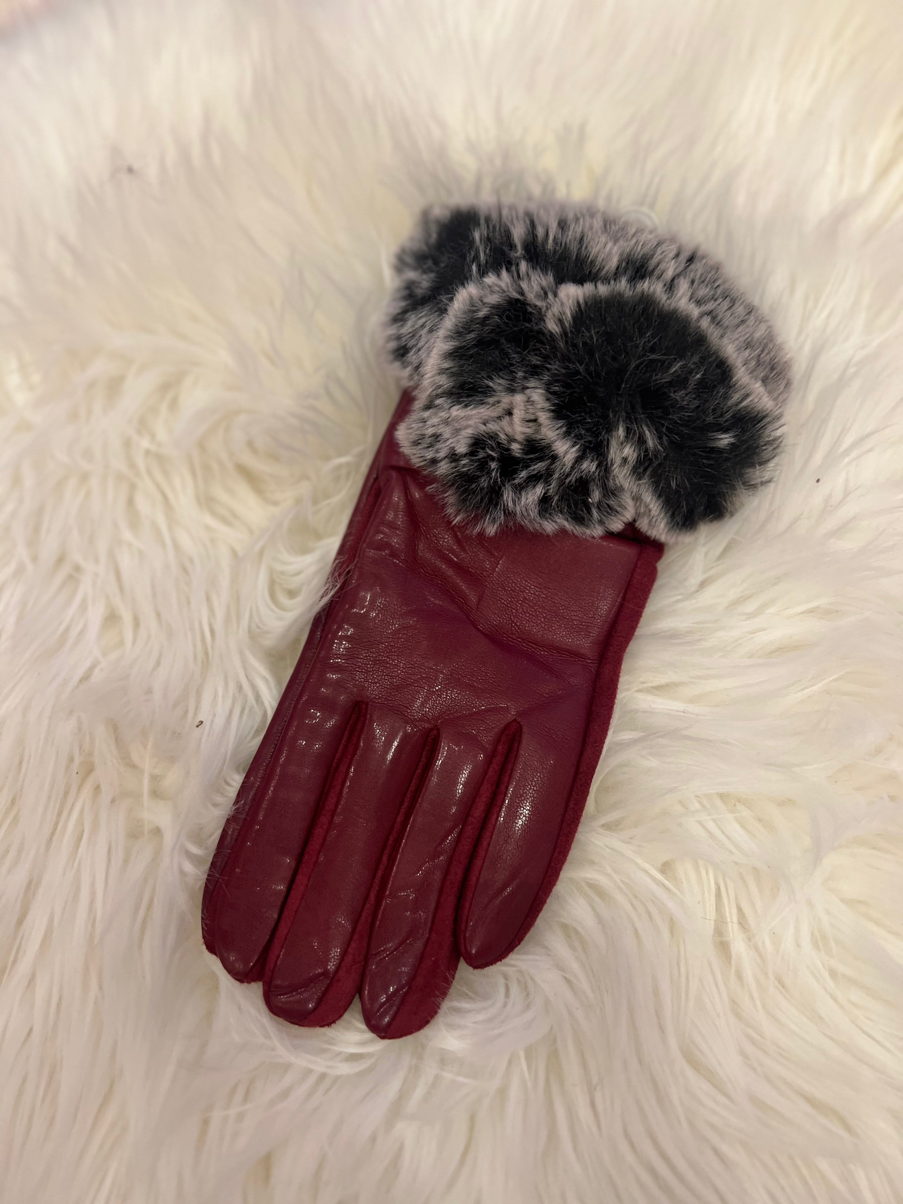 Our collection of gloves make the perfect holiday gift! These burgundy leather like gloves have a grey swirly faux fur trim