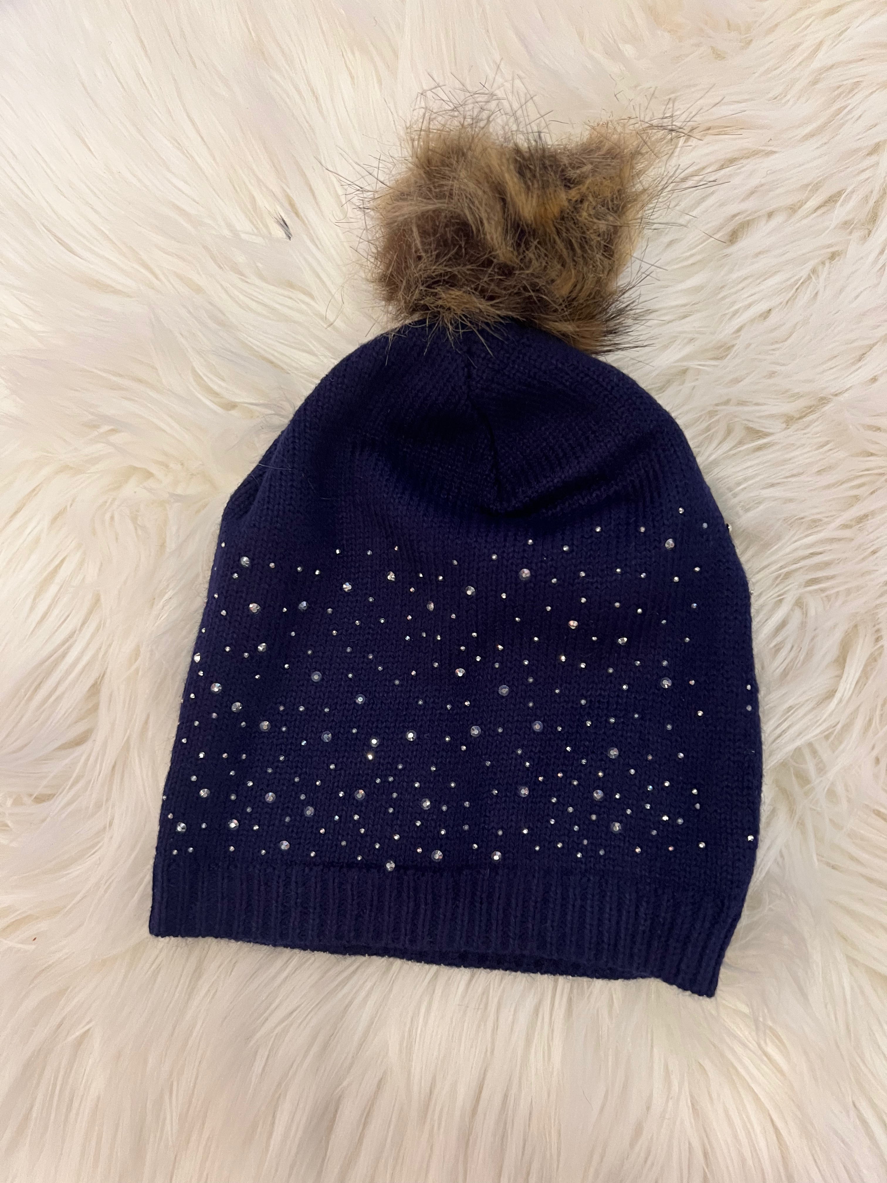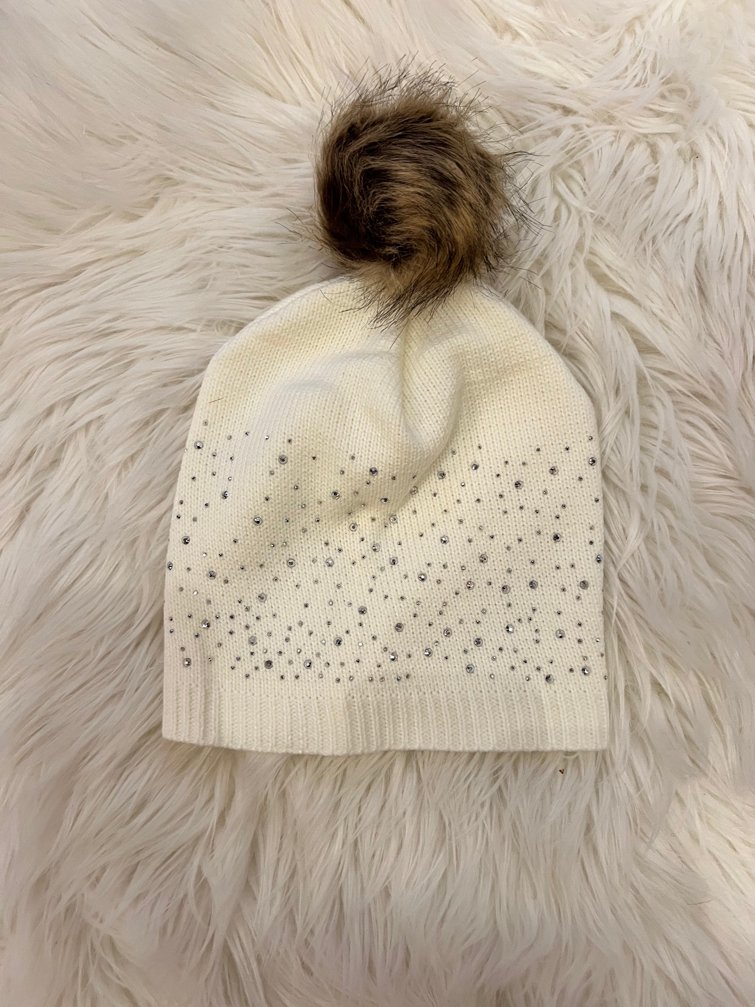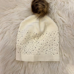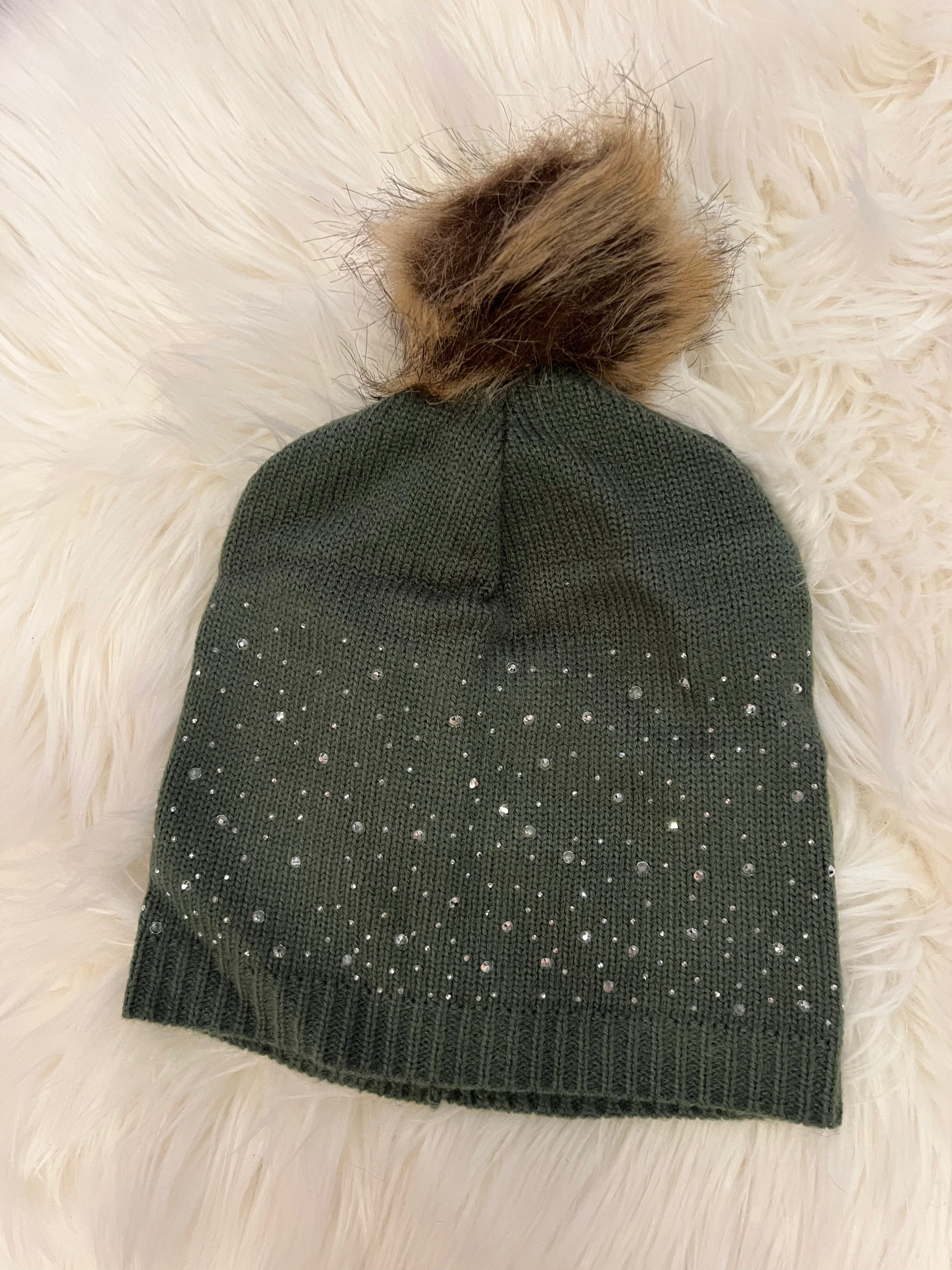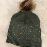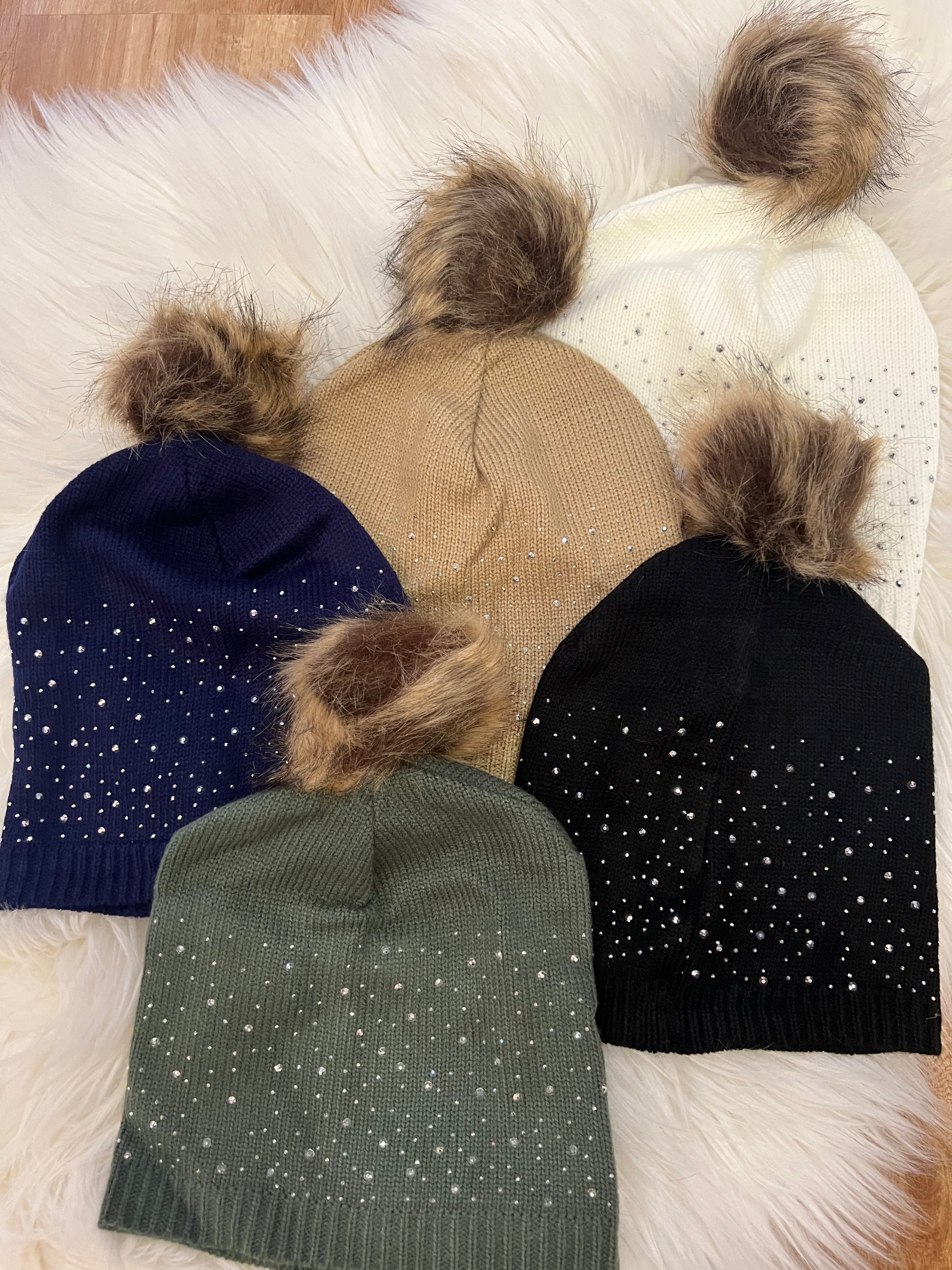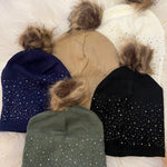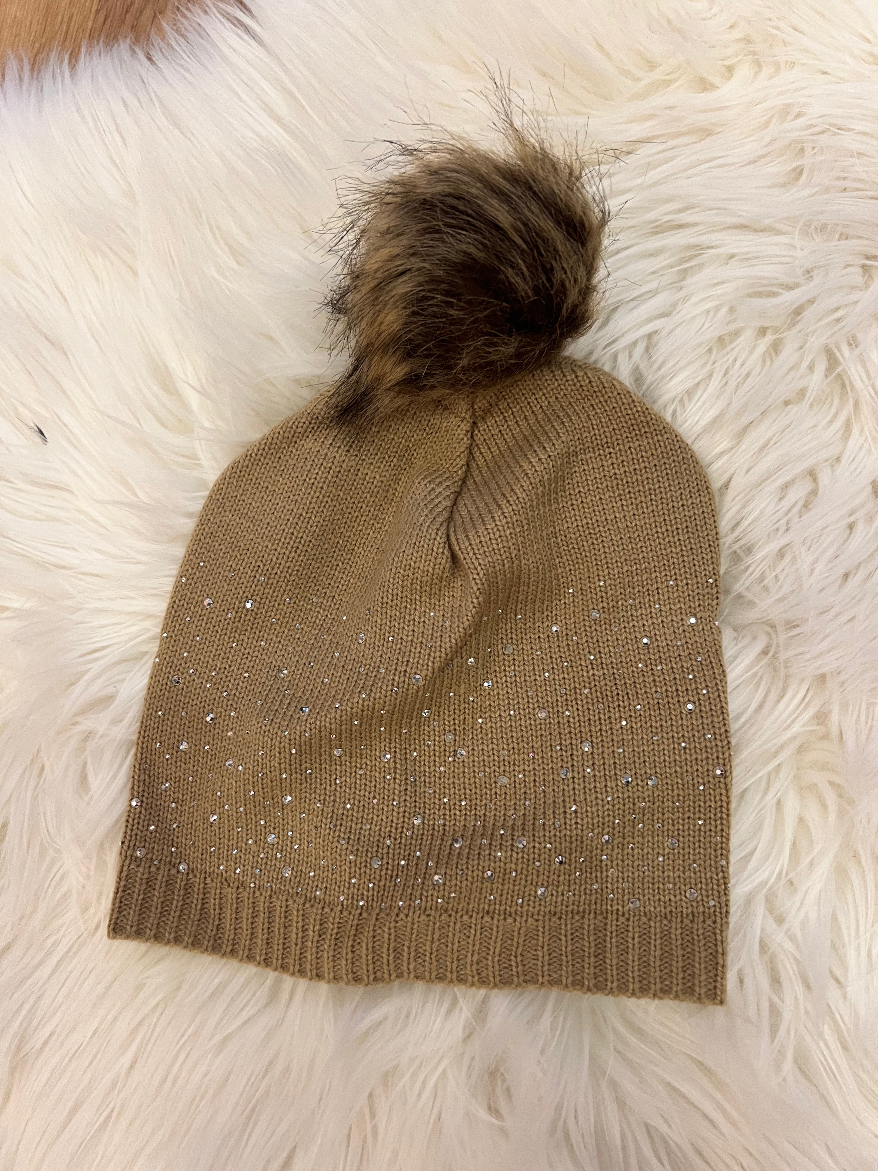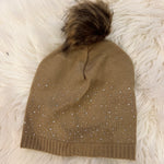 Keep your head warm & stylish all winter long! This lightweight knit beanie has a tan puffball on the top & silver rhinestones on it