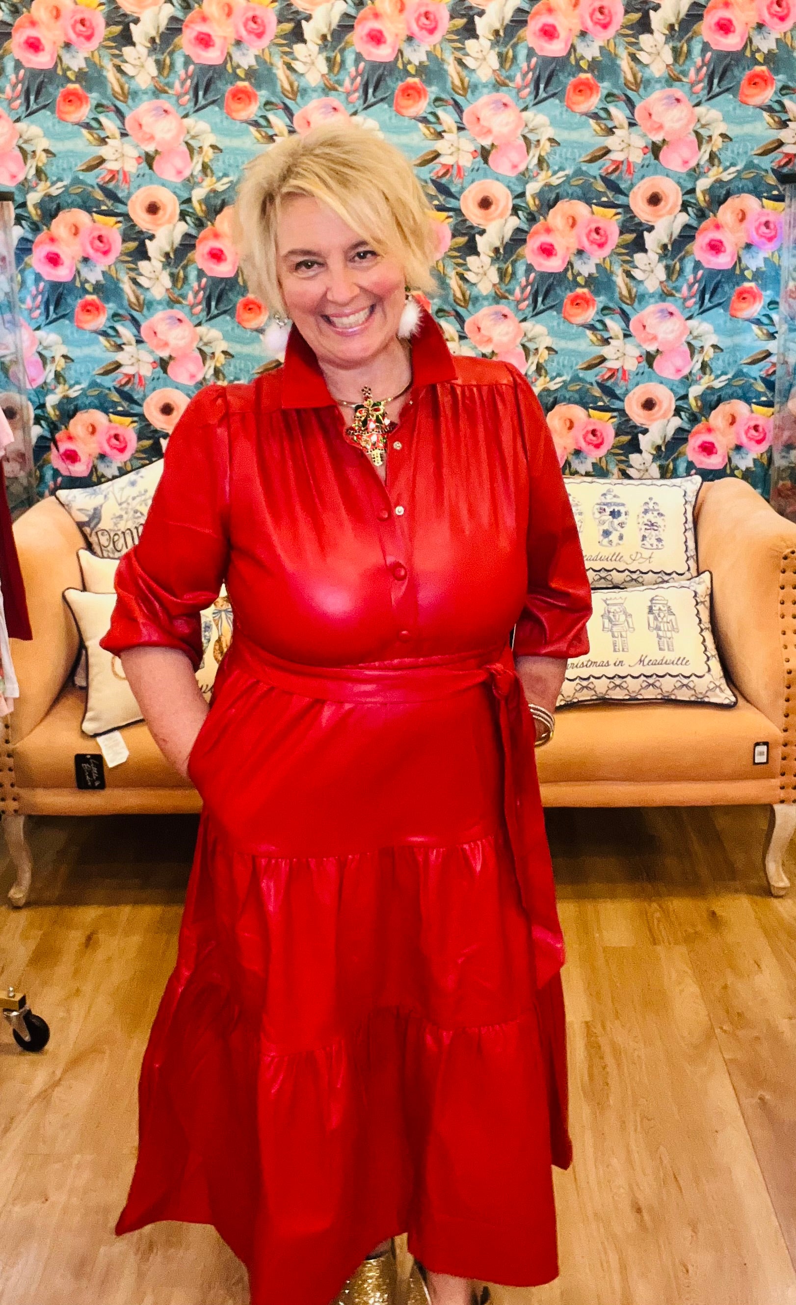 A stunning cranberry colored faux leather dress for the holidays! This midi dress by Fate buttons all the way down the front & has a tie belt. Grab your black tights & stilettos for your next Christmas party!