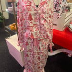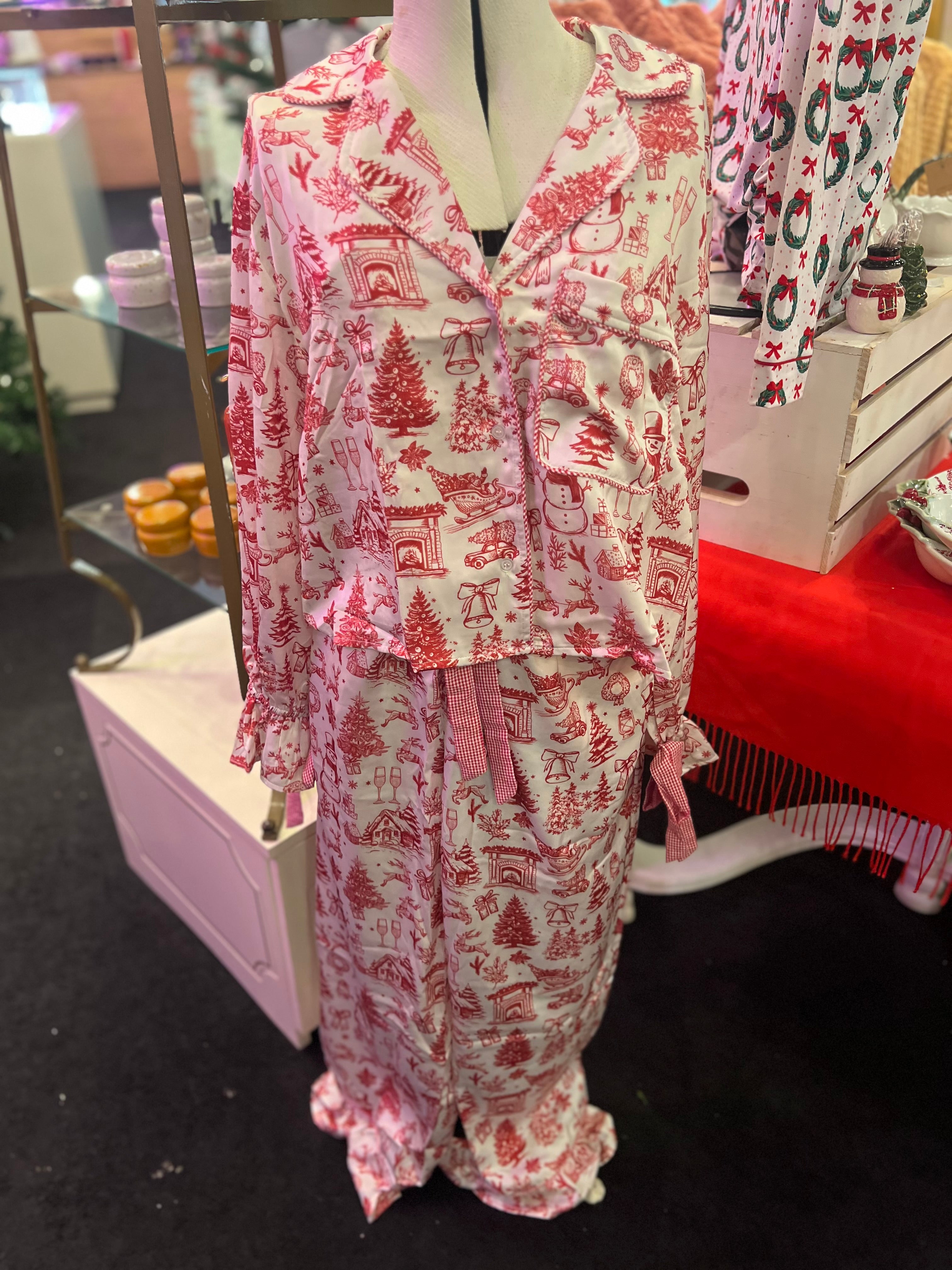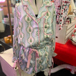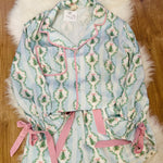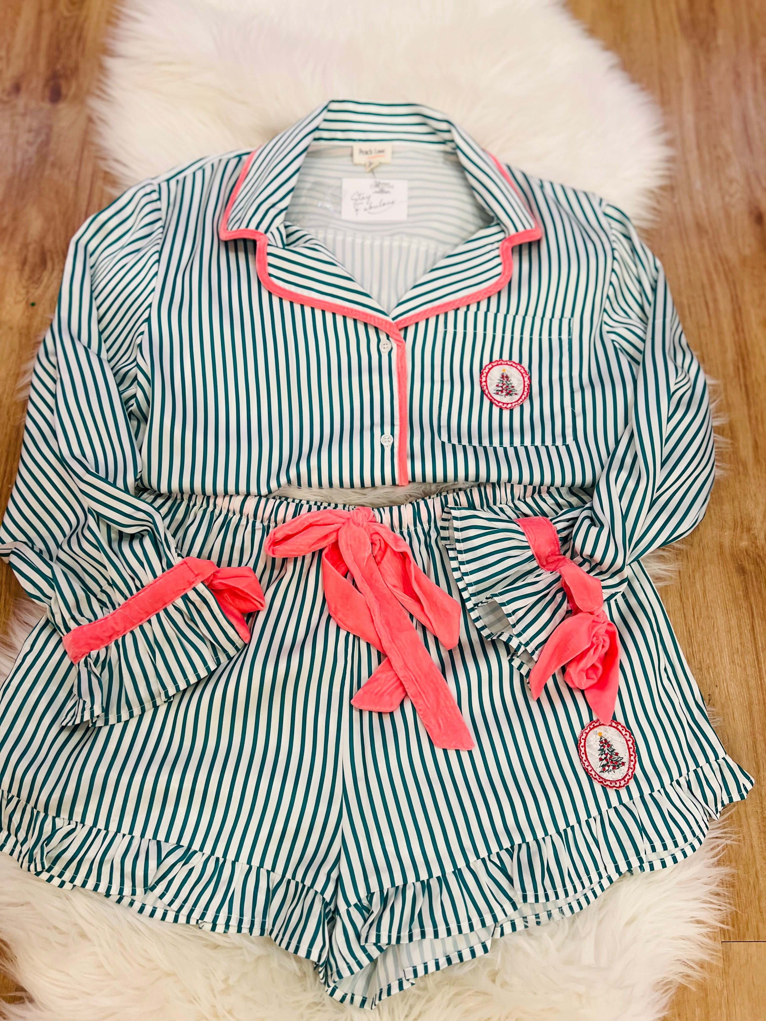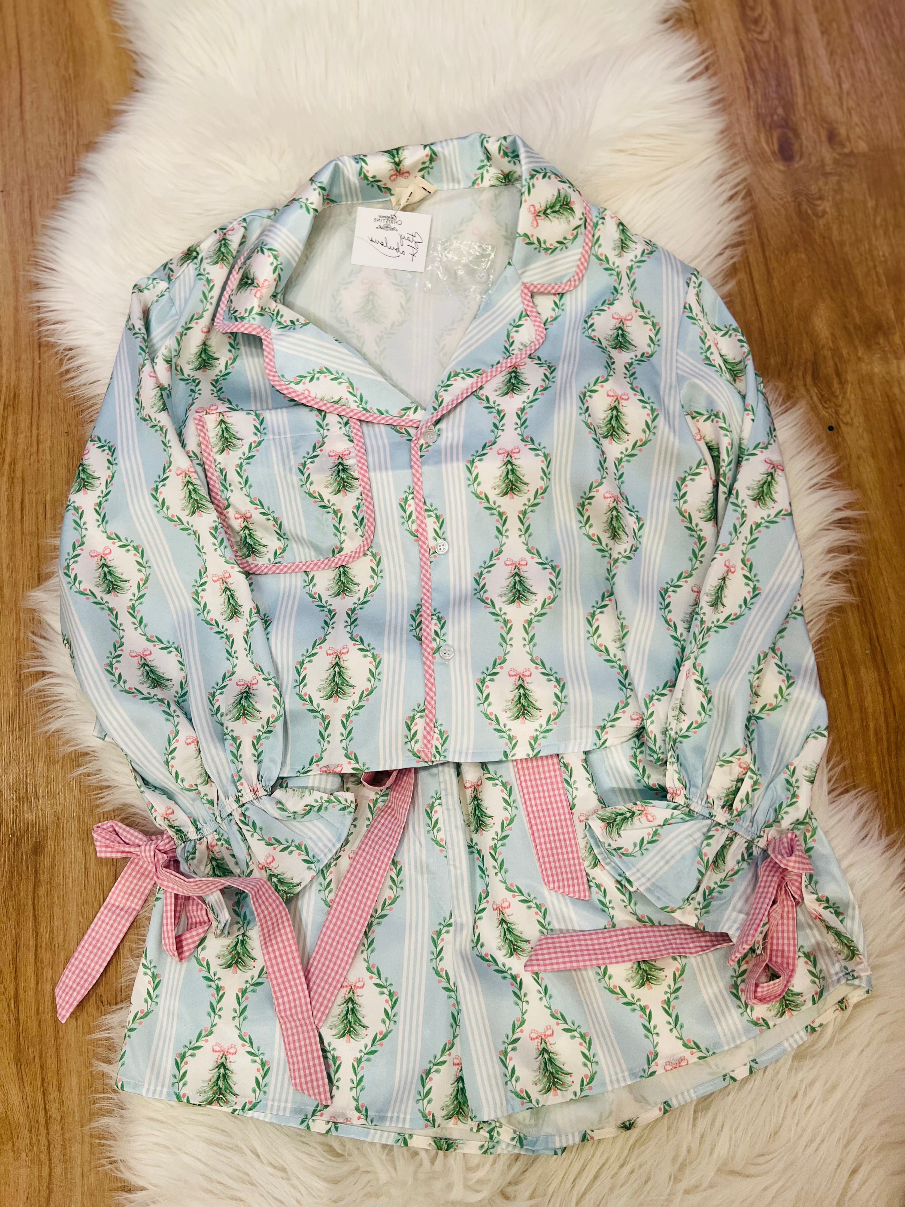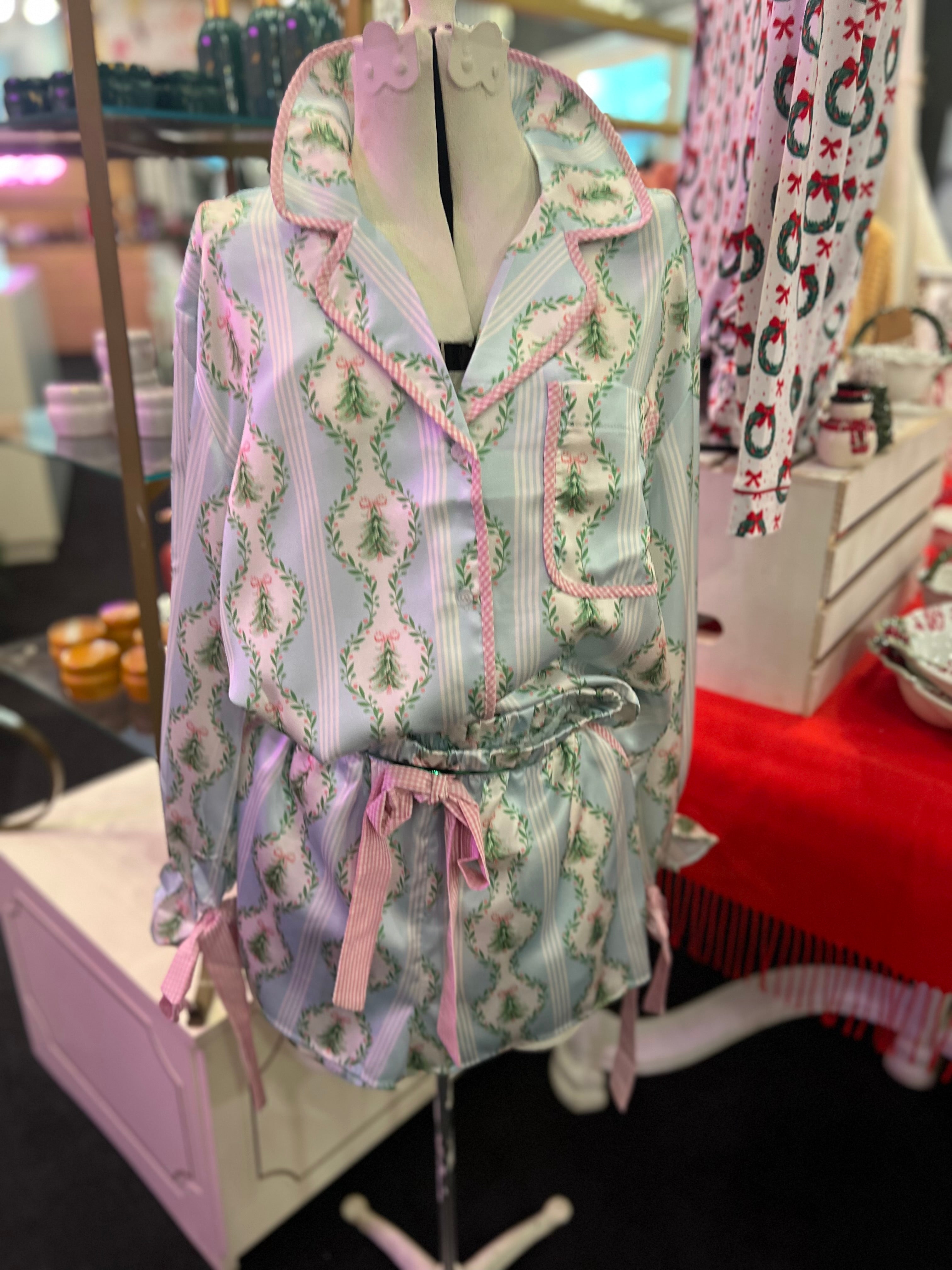 Perfect for Christmas Eve Jammies or opening presents on Christmas morning! These satin pajama sets by Peach Love California come with a button down top & shorts. Each set has a fun unique velvet contrast bow detail!