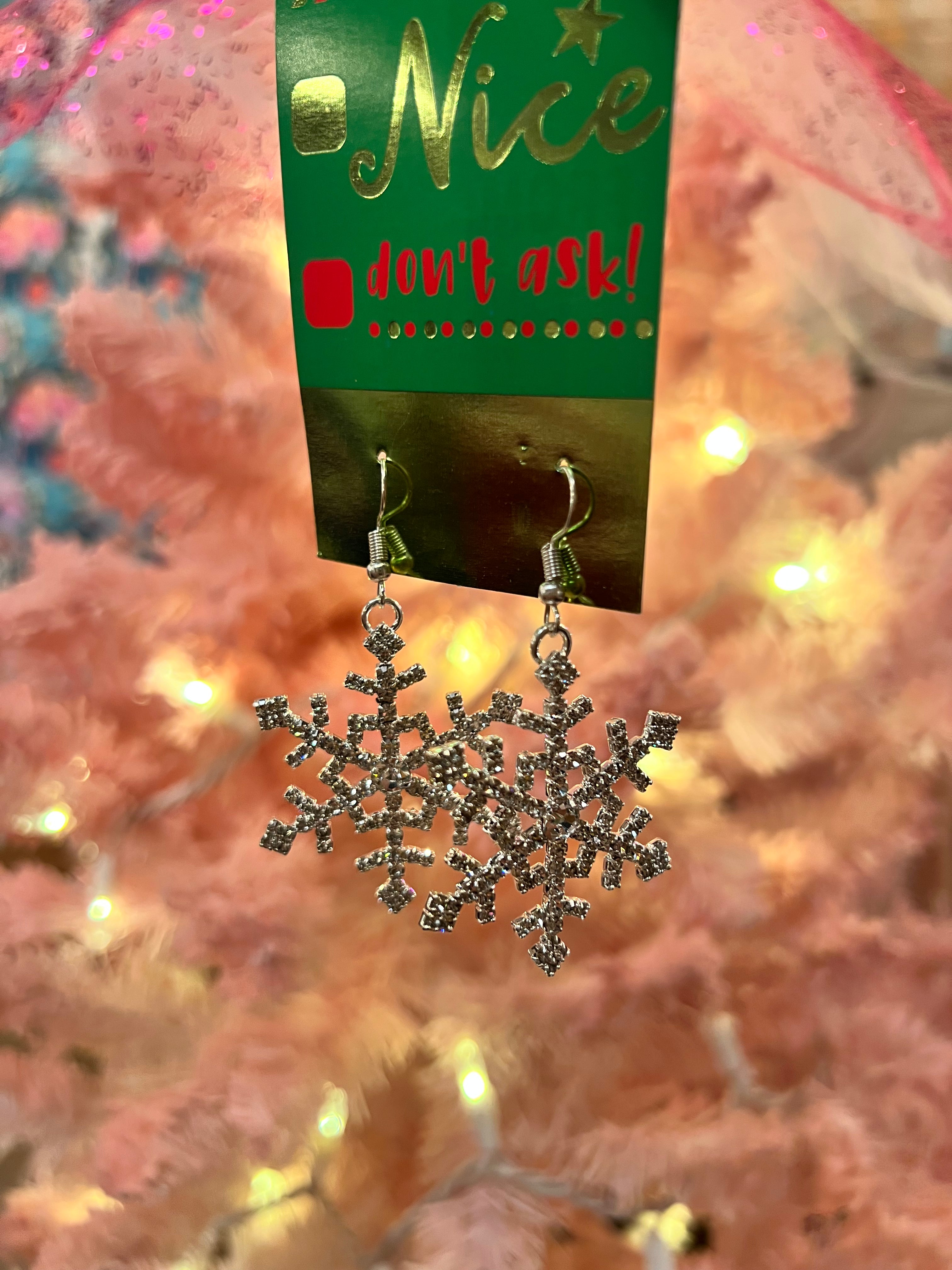Sparkle all winter long with these stunning snowflake earrings! Each pair is on a french wire back with a dangle rhinestone covered snowflake that's a little larger than a quarter