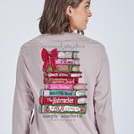 Driftwood grey long sleeve shirt with the phrase 'One more chapter please' and a stack of Christmas themed books. Simply Southern logo below. Similar design on left chest. 100% cotton. Unisex sizing
