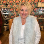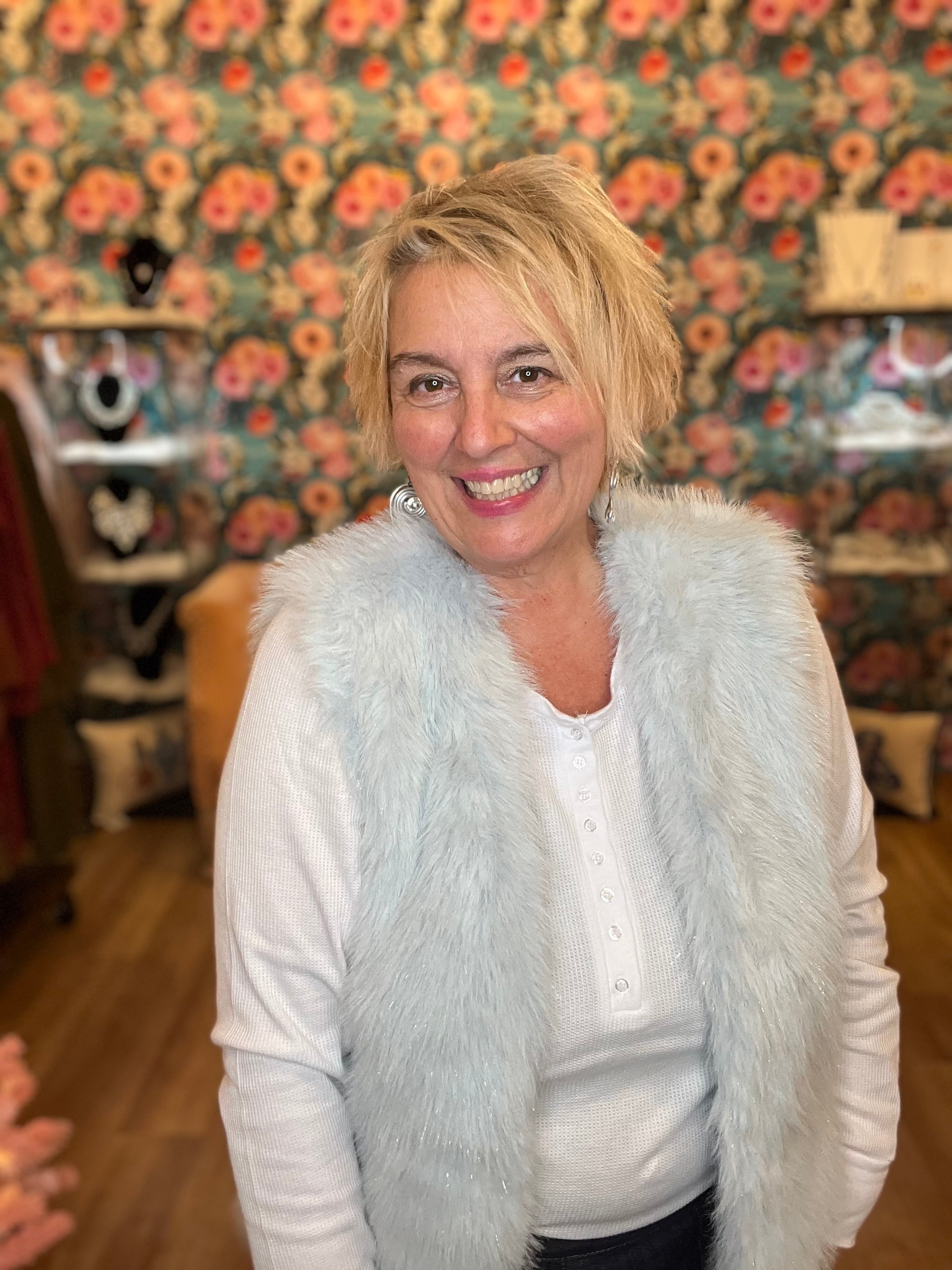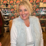 A fur vest with some shimmer! This open front faux fur vest comes in icy blue & ivory. Wear it over your favorite sweater this winter or dress it up over top of a classic button down
