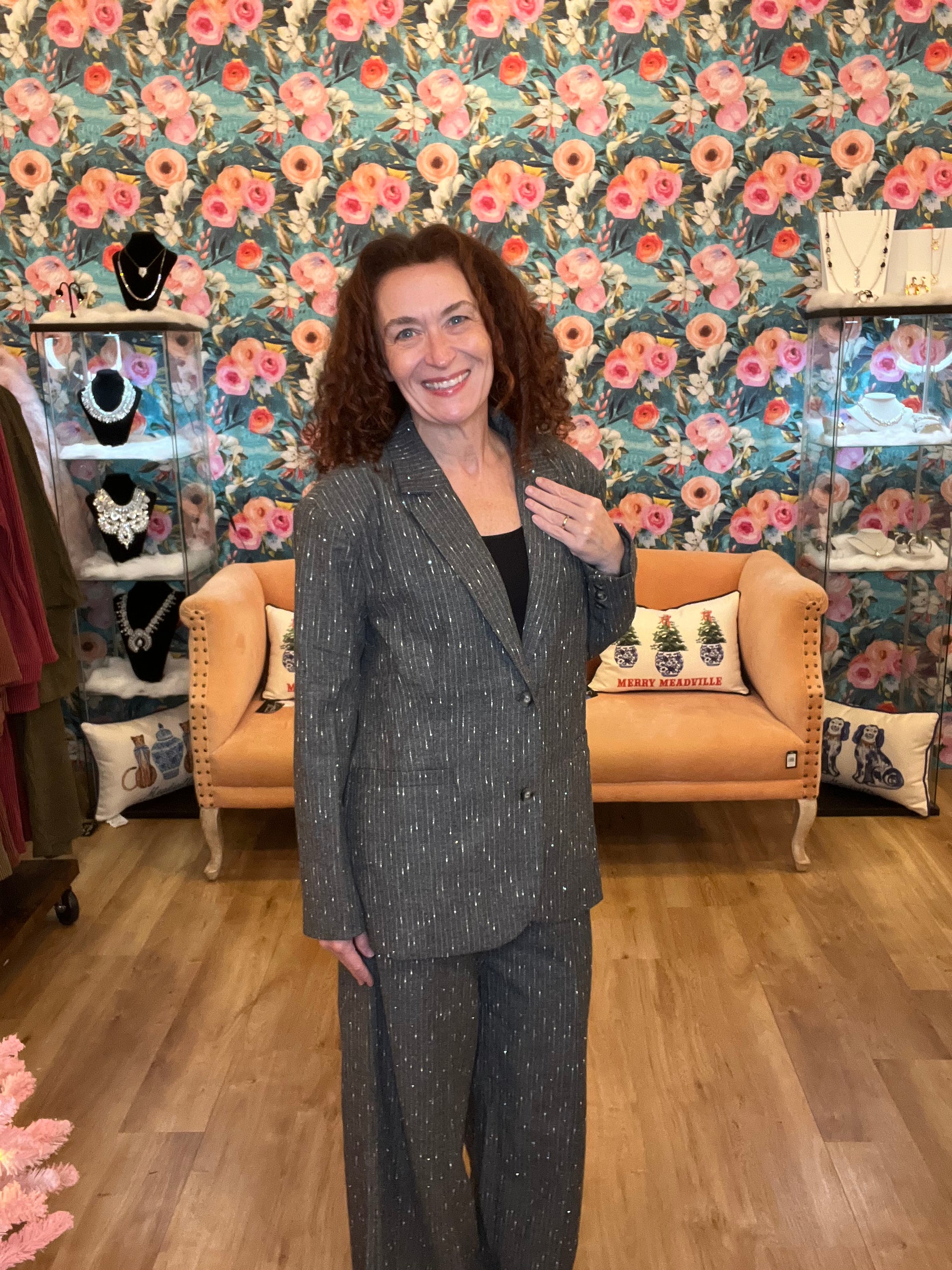 Workwear but make it fun! This oversized pinstripe blazer has little silver sequins throughout the entire thing. If you want to make a statement while looking sophisticated then this is for you! Don't forget the matching trouser!