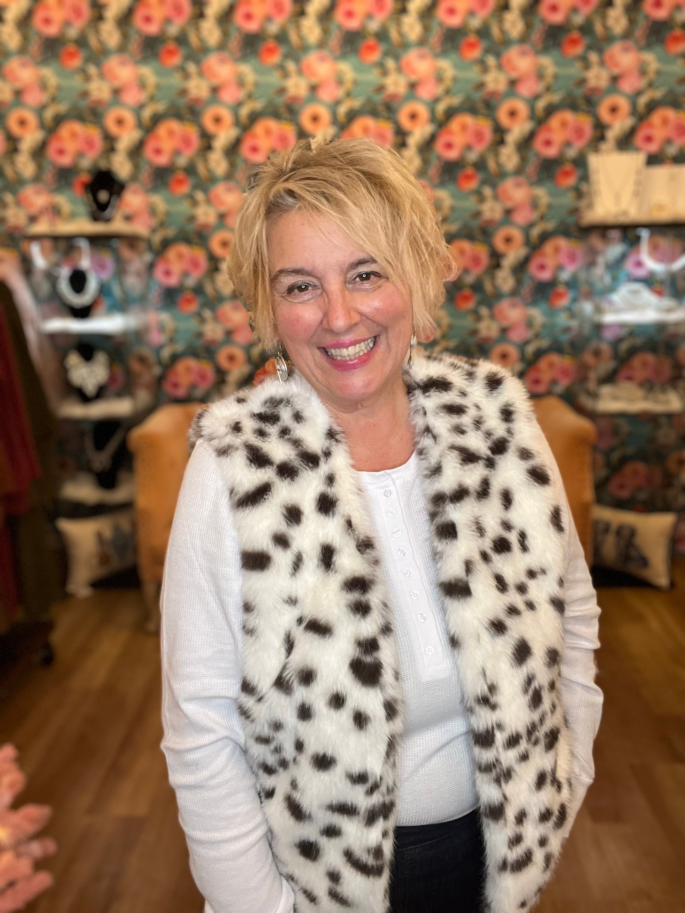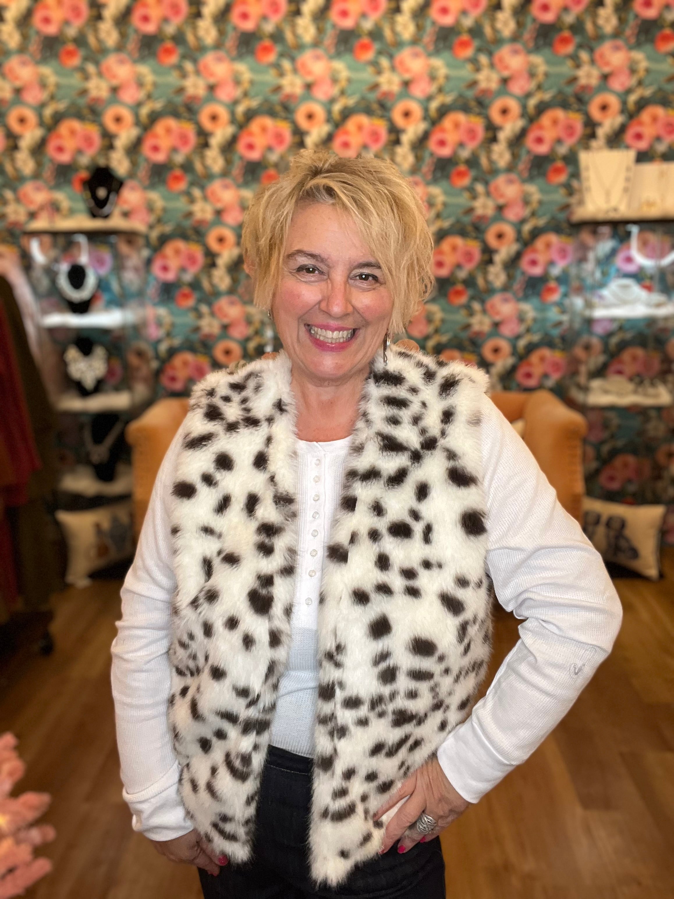 Leopard lovers - you need this faux fur vest! This open front faux fur vest looks like a snow leopard with its subtle spots. Wear it over a black sweater with your go to black leggings