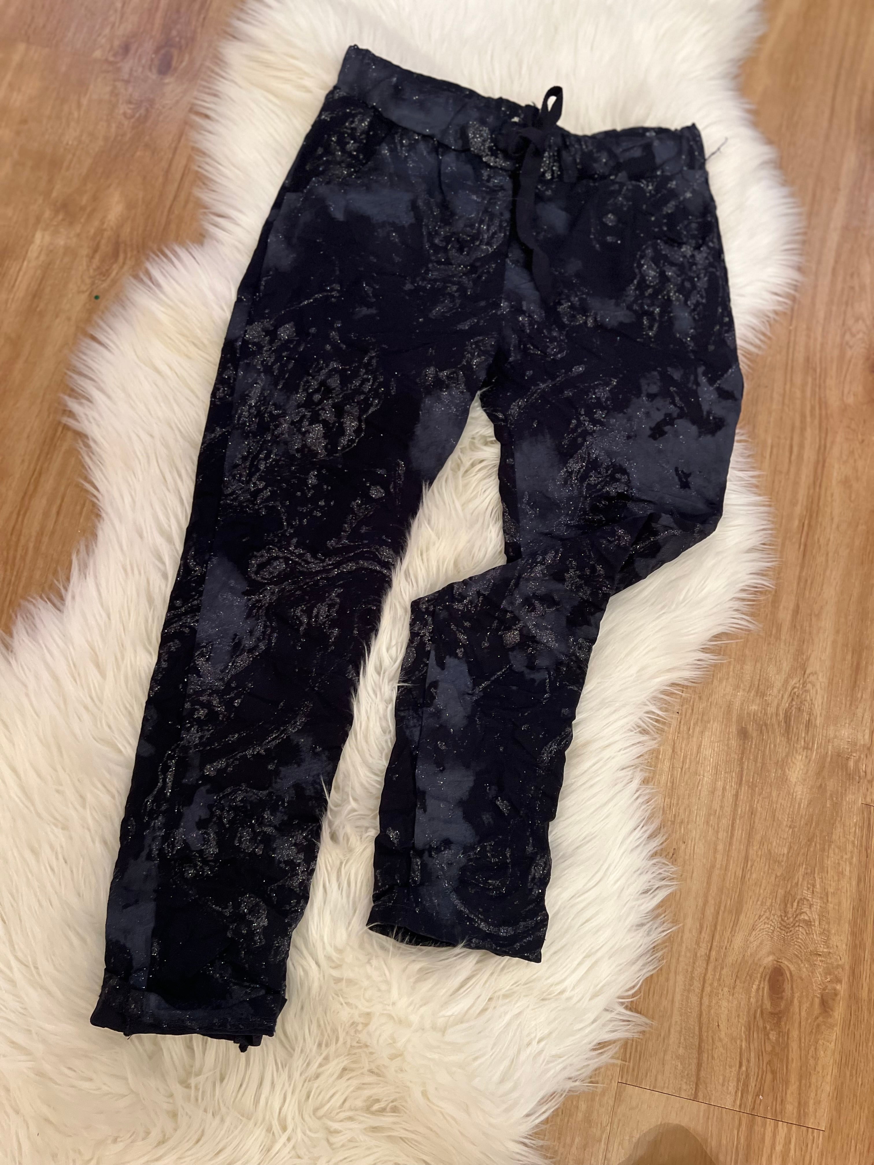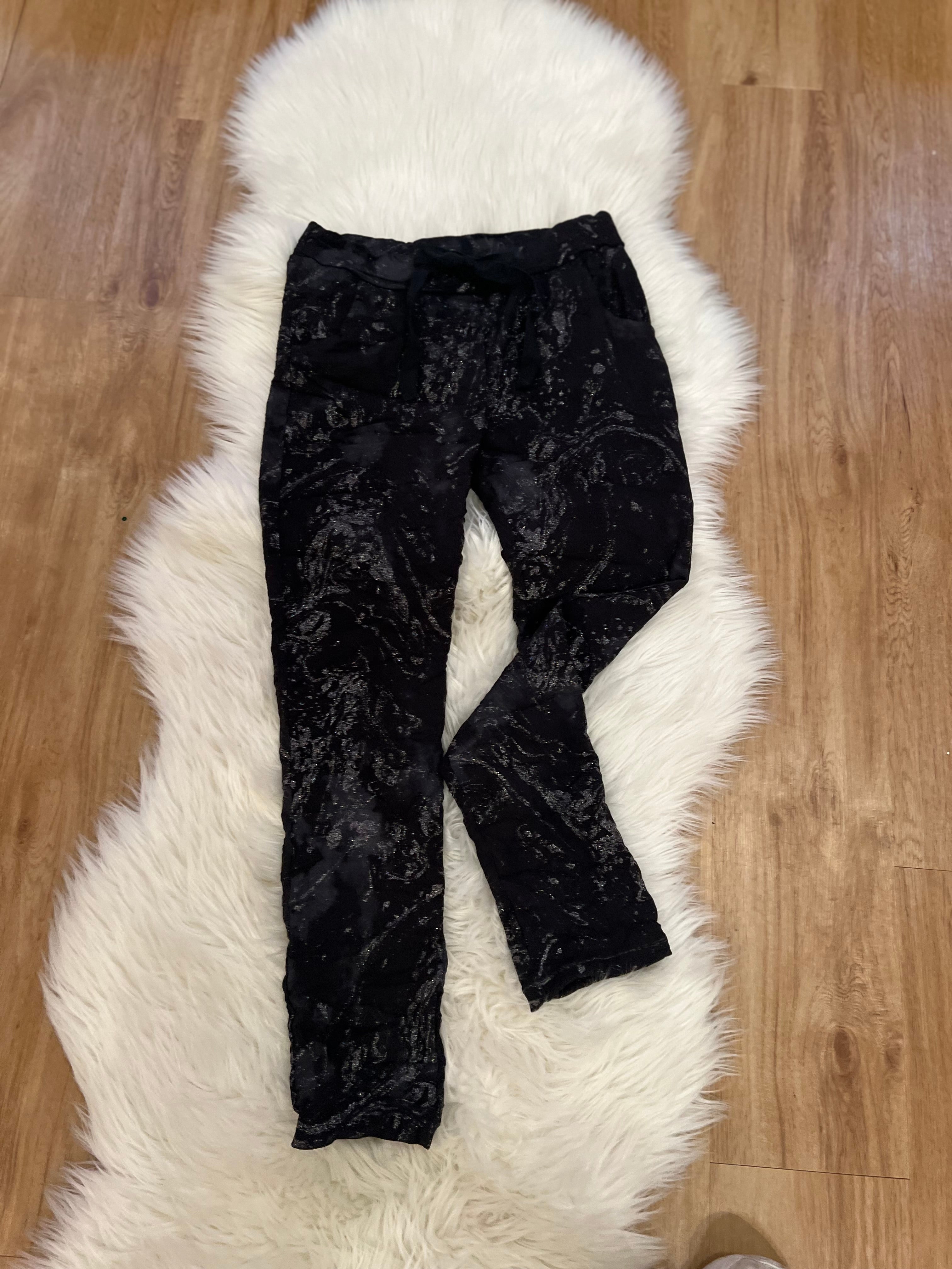 Made in Italy pants that you will wear all season long! These lightweight joggers are part of our Italian collection that flies off the shelfs. They have an elastic waist with a subtle silver shimmer pattern in them. Wear them with your favorite sweater or a sequins top into the holidays