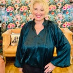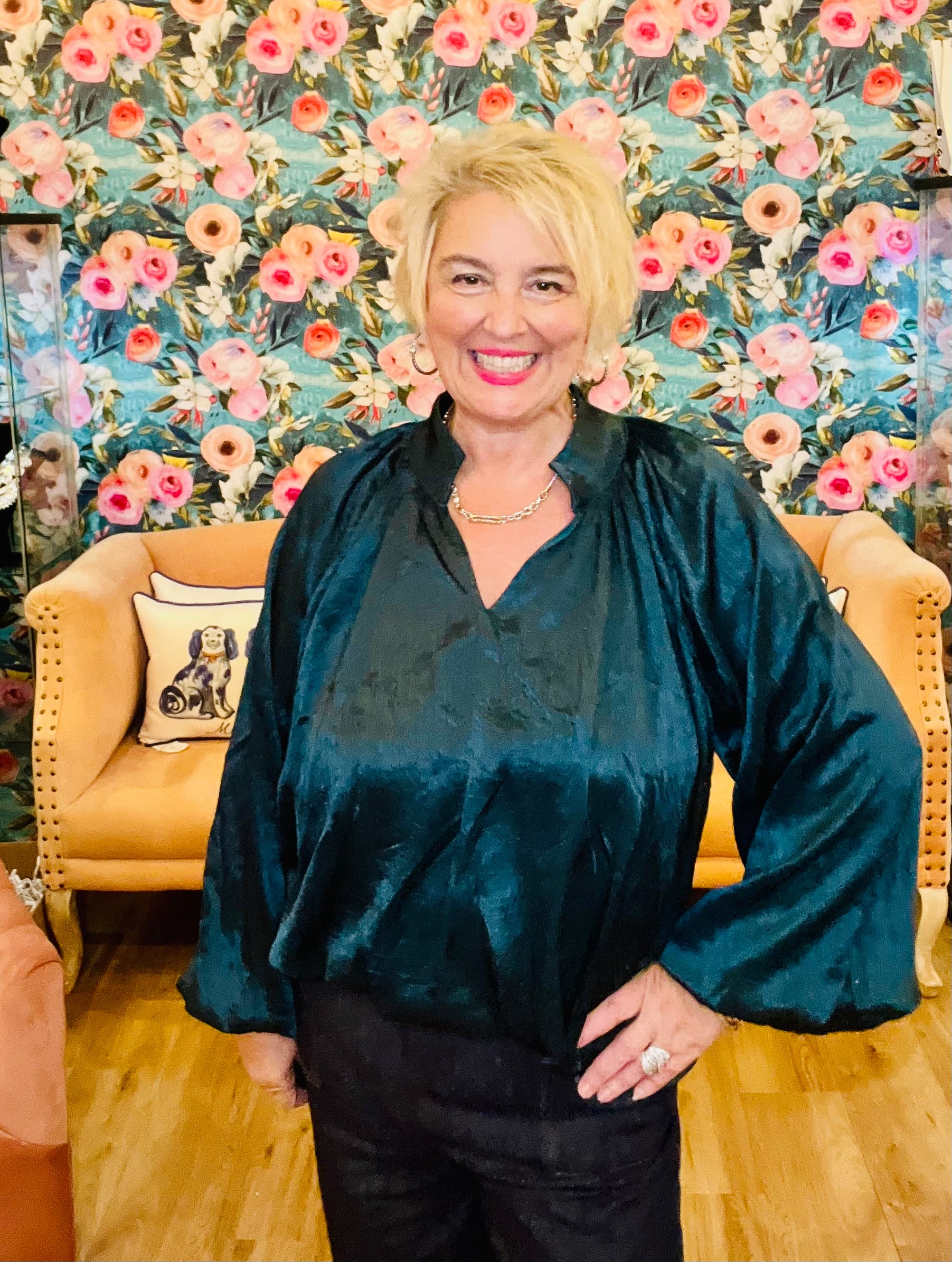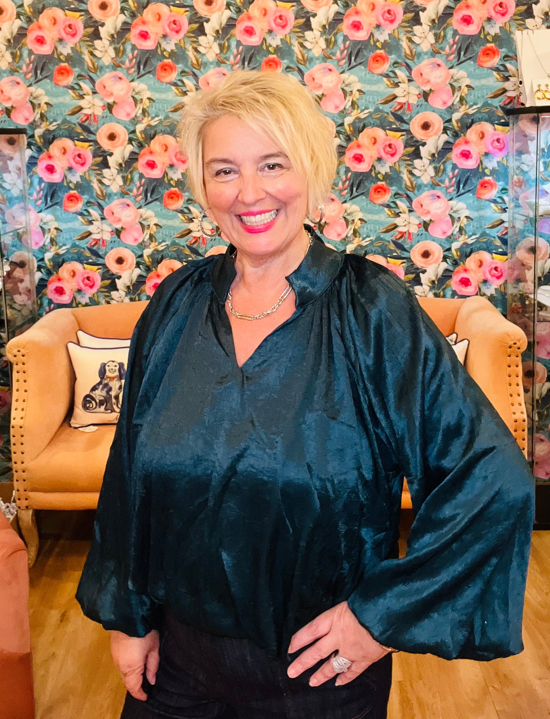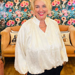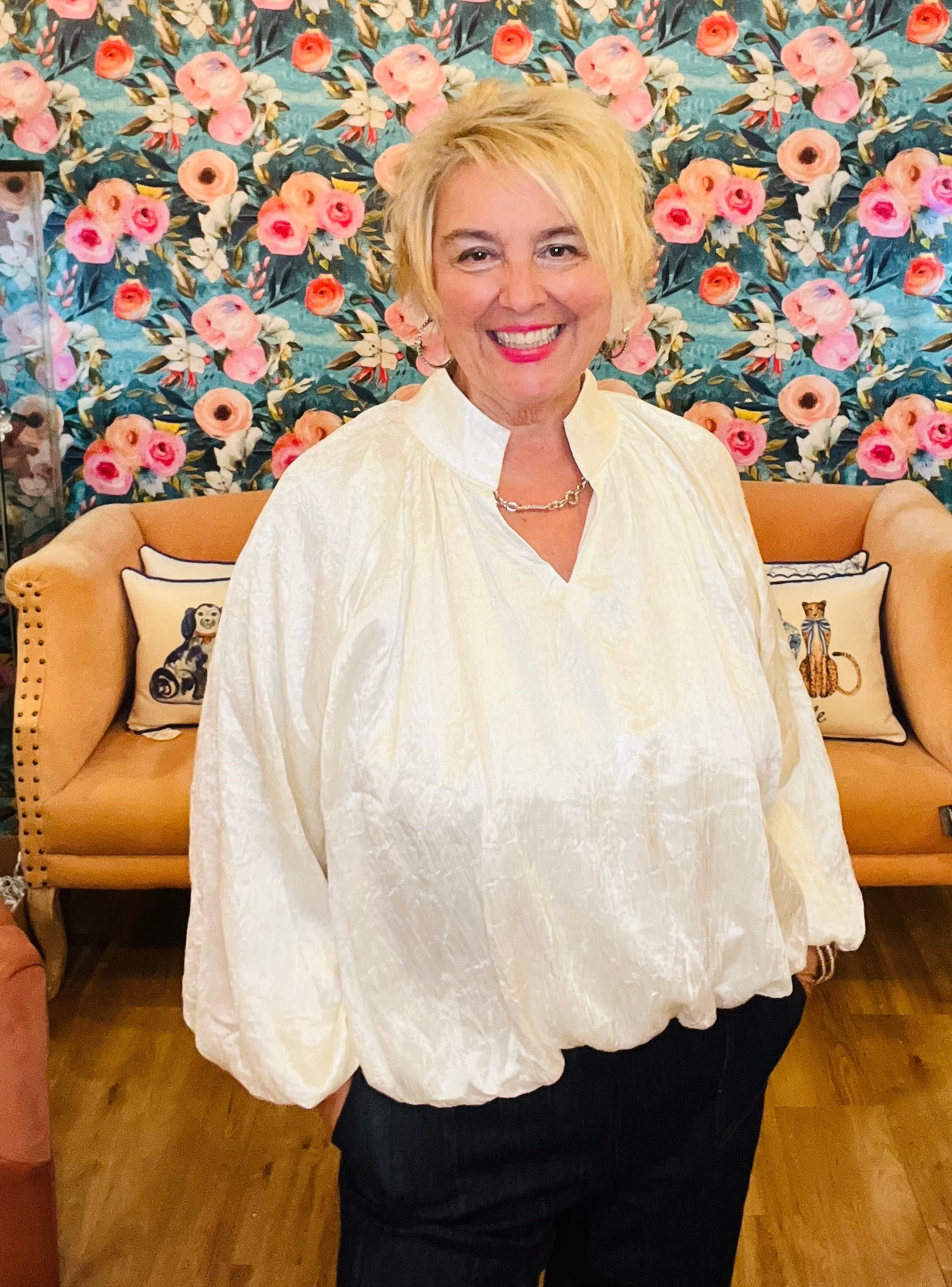 It's all in the details - and this top has them! If you look closely, there is 3D floral designs throughout the entire blouse. It also has a fun puff sleeve & stand up collar, all fun & unique details!
