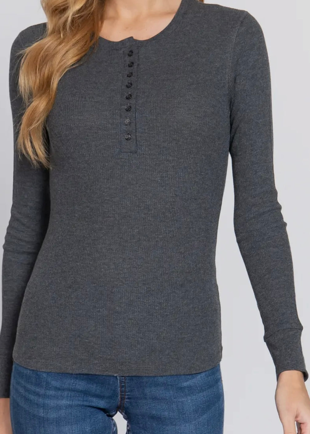 The perfect base layering piece! Wear this henley under your favorite flannel, jacket or coat. The thermal ribbed material will keep you nice & warm