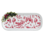 The Toile Everything Plate is a charming addition to any table setting, combining elegance and functionality. Crafted from high-quality stoneware, this plate features a beautifully detailed toile surface that adds a touch of sophistication to your dining experience. The hand-painted holly cluster or bow attachment enhances its festive appeal, making it perfect for holiday gatherings or everyday use. Measuring 4" x 9", this versatile plate is ideal for serving appetizers, desserts, or small bites. Its fluted design adds a classic touch, while the durable stoneware construction ensures long-lasting use. Elevate your table decor with this exquisite piece that seamlessly blends style and practicality.